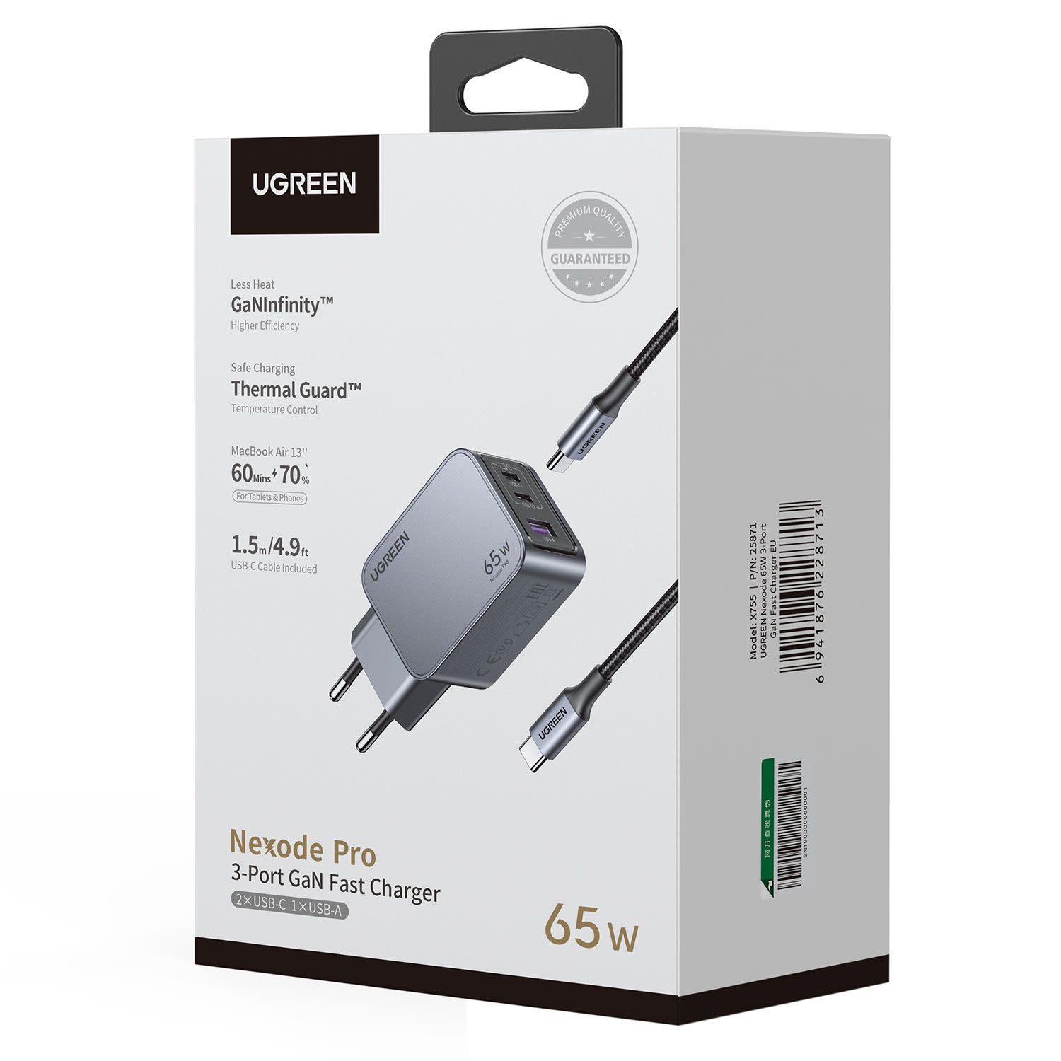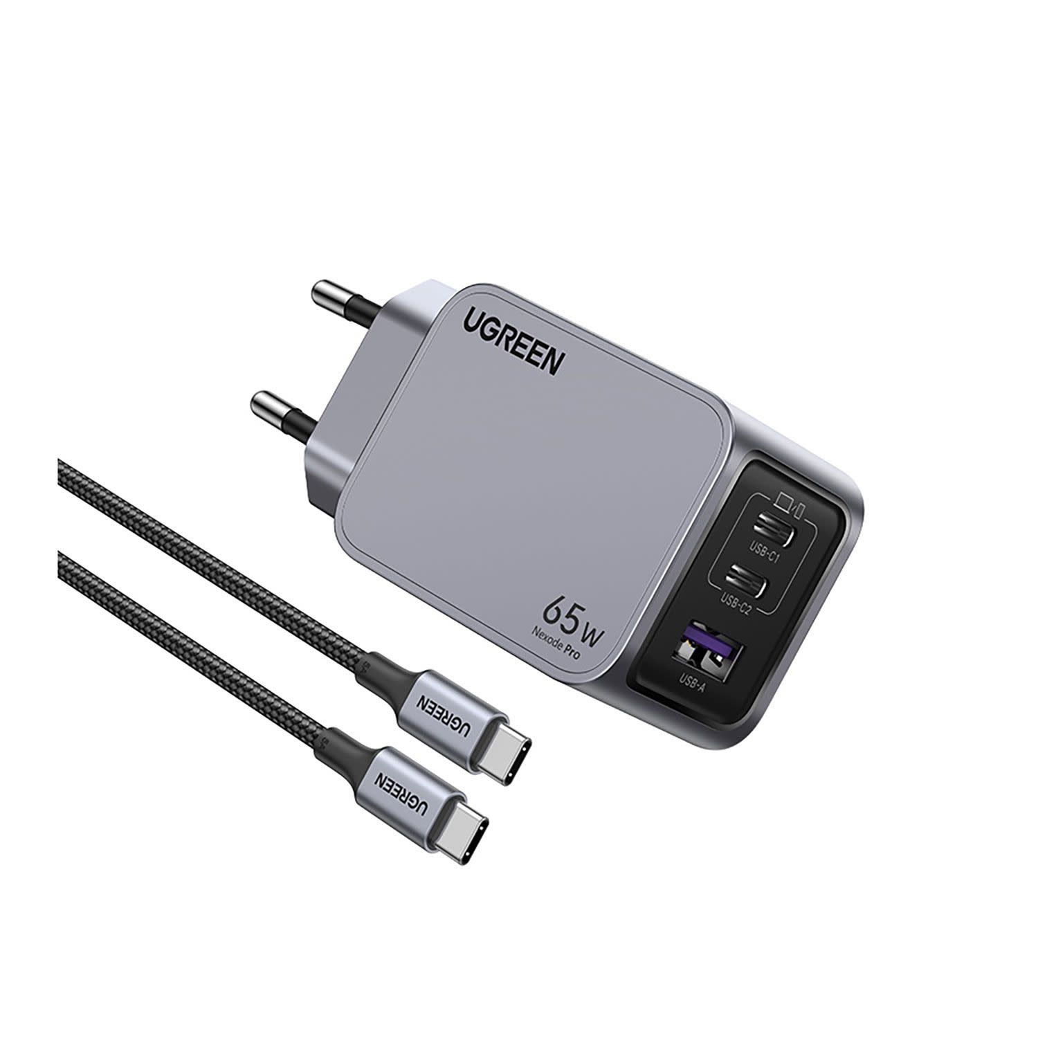Ugreen Φορτιστής GaN 3 Θέσεων 65W Γκρι Με Καλώδιο
