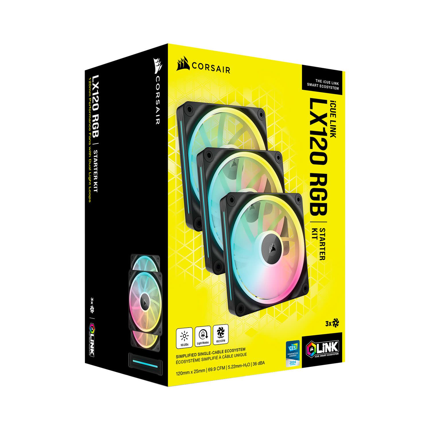 O ανεμιστήρας CORSAIR LX120 RGB διαθέτει διπλό φωτιζόμενο δακτύλιο με 18x RGB LEDs, δύο ζώνες φωτισμού ανά πλευρά, τεχνολογία CORSAIR AirGuide για καλύτερη ροή αέρα, μαγνητικό μηχανισμό ρουλεμάν (Magnetic Dome Bearing), διαστάσεις 120 x 25mm και η ταχύτητα περιστροφής τους κυμαίνεται μεταξύ 400 και 2400 RPM ±10% για ροή αέρα της τάξης των 9,75-69,9 CFM.