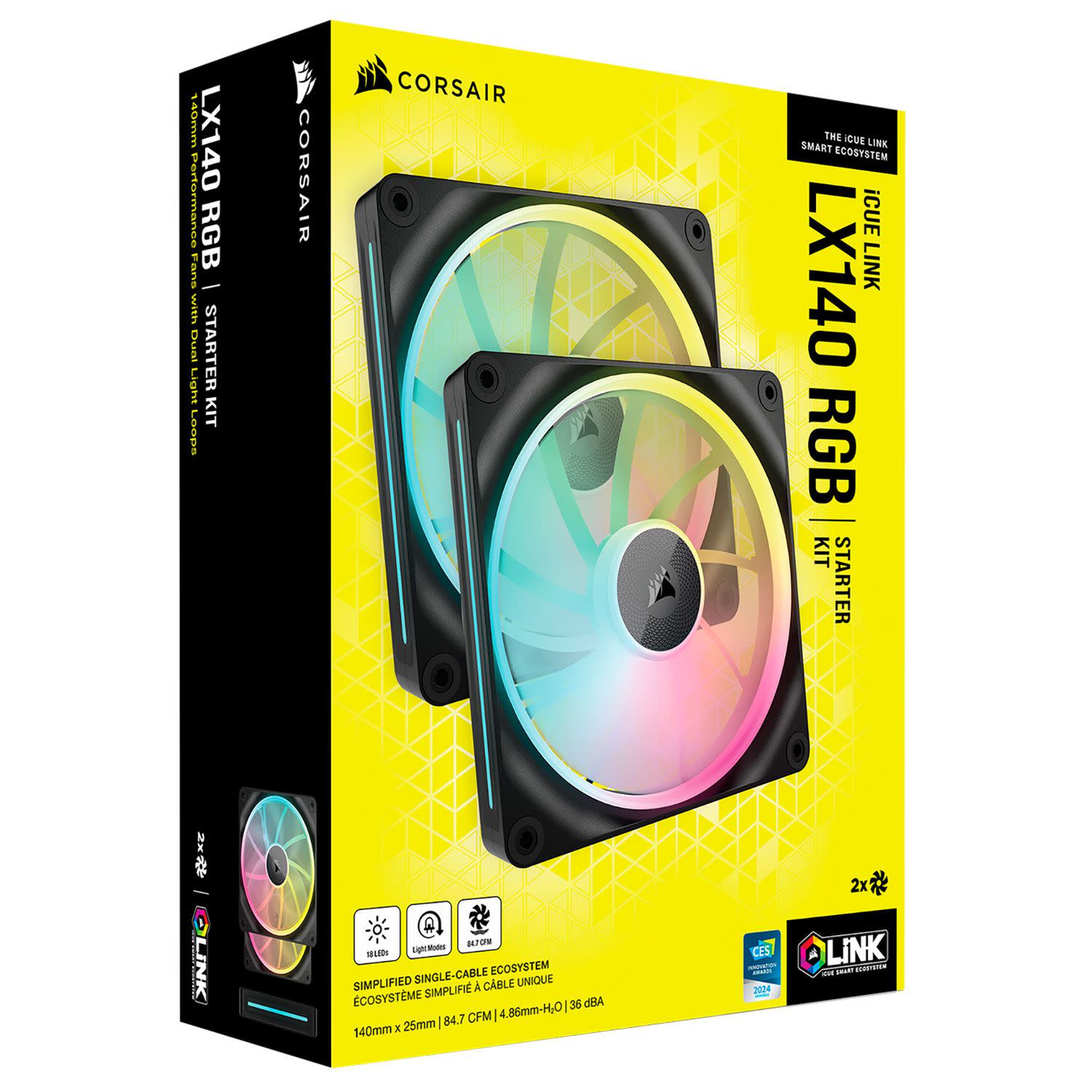 Kit εκκίνησης CORSAIR LX140 RGB iCUE LINK που περιλαμβάνει δύο ανεμιστήρες LX140 RGB 140mm PWM, δύο iCUE LINK Connectors, το iCUE LINK System Hub και ένα καλώδιο iCUE LINK μήκους 600 mm.