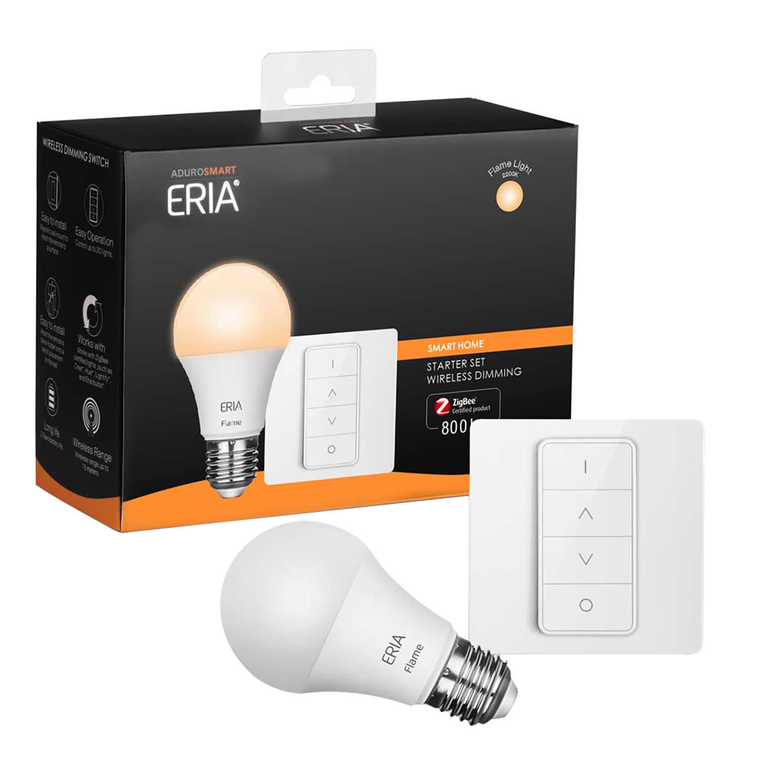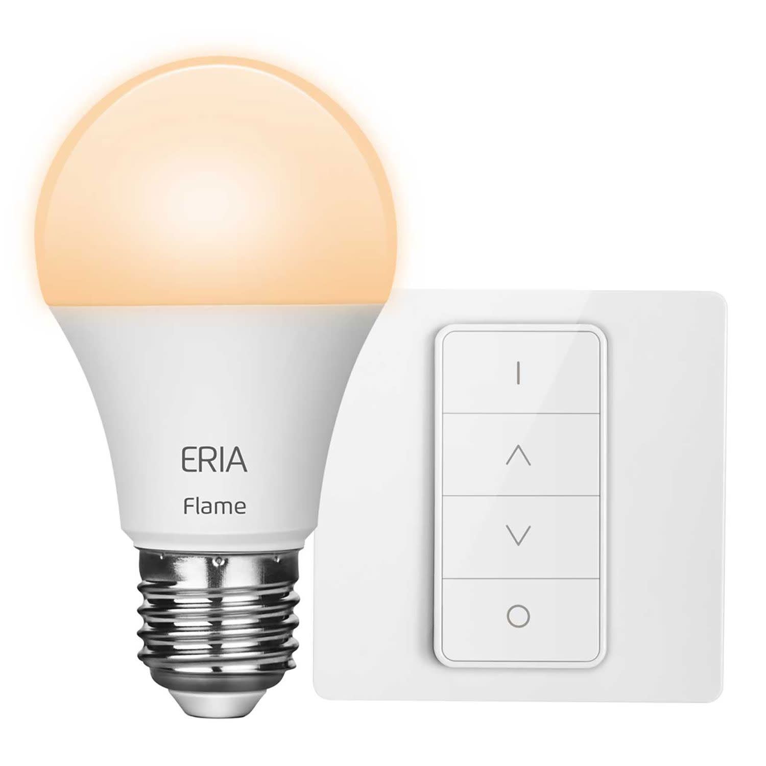 To ERIA Smart Wireless Dimming Starter Kit περιλαμβάνει ένα Wireless Dimmer και έναν έξυπνο λαμπτήρα εσωτερικής χρήσης ERIA Flame (E27, 2200K) για έξυπνο «out-of-the-box» φωτισμό.