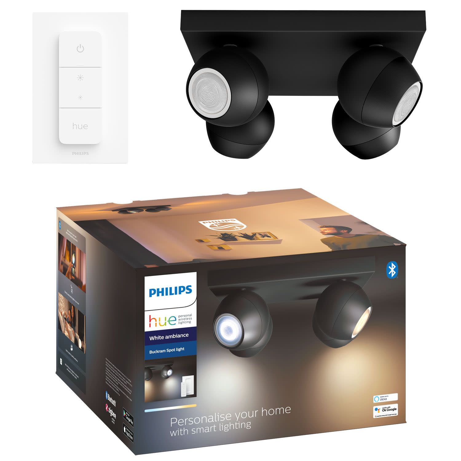 Το τετραπλό σποτ Philips Hue White Ambiance Buckram παρέχει ρυθμιζόμενη ένταση με διακόπτη Hue Dimmer για απόλυτη άνεση, ιδανική ατμόσφαιρα με λευκό φωτισμό θερμού έως ψυχρού φωτός και διαθέτει εφαρμογή Hue Bluetooth, για πρακτικό έλεγχο!