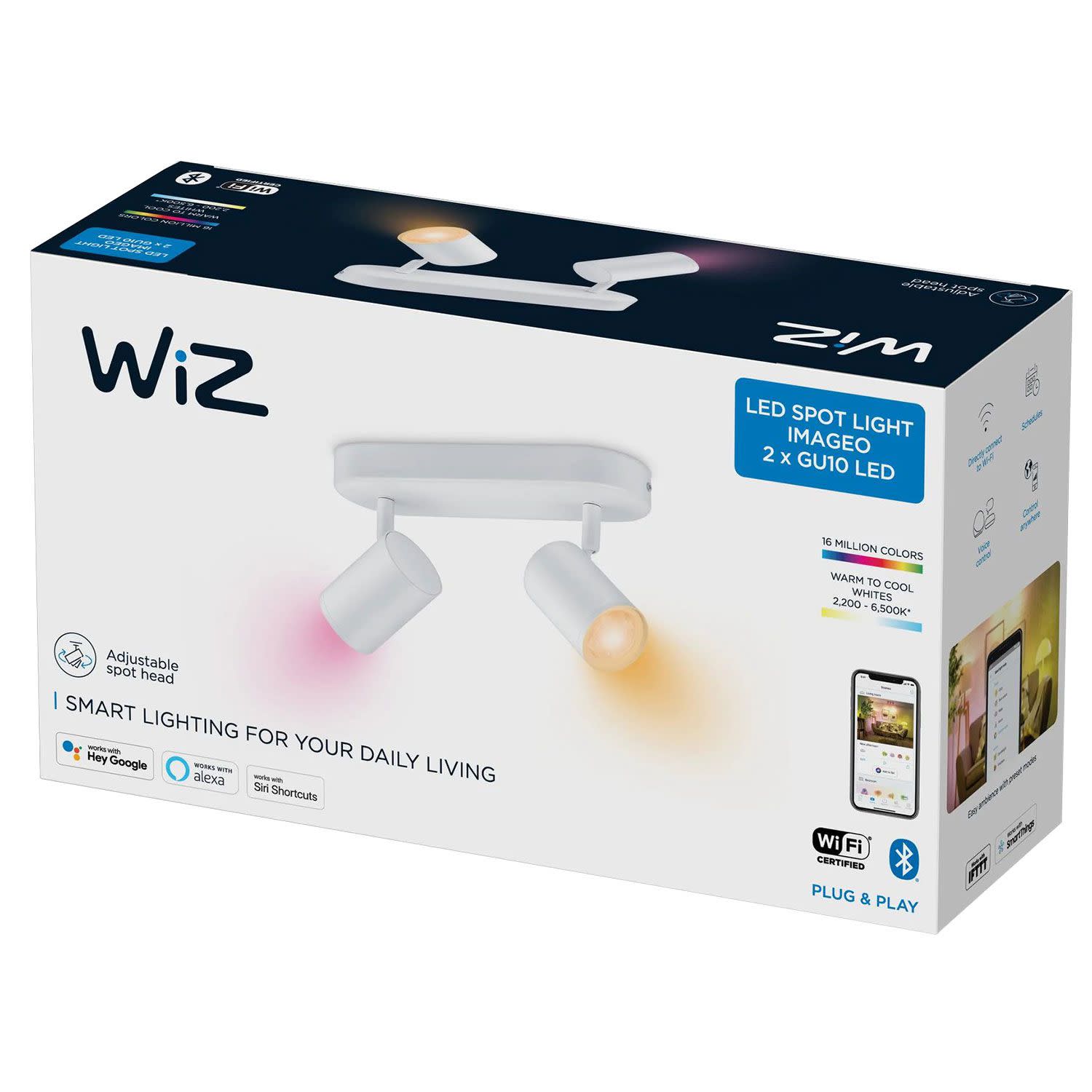 Βάση οροφής με δύο έξυπνα σποτ WiZ Imageo με έγχρωμο φως. Συνδέεται στο ασύρματο οικιακό δίκτυο Wi-Fi και ο έλεγχος πραγματοποιείται με το WiZ app.