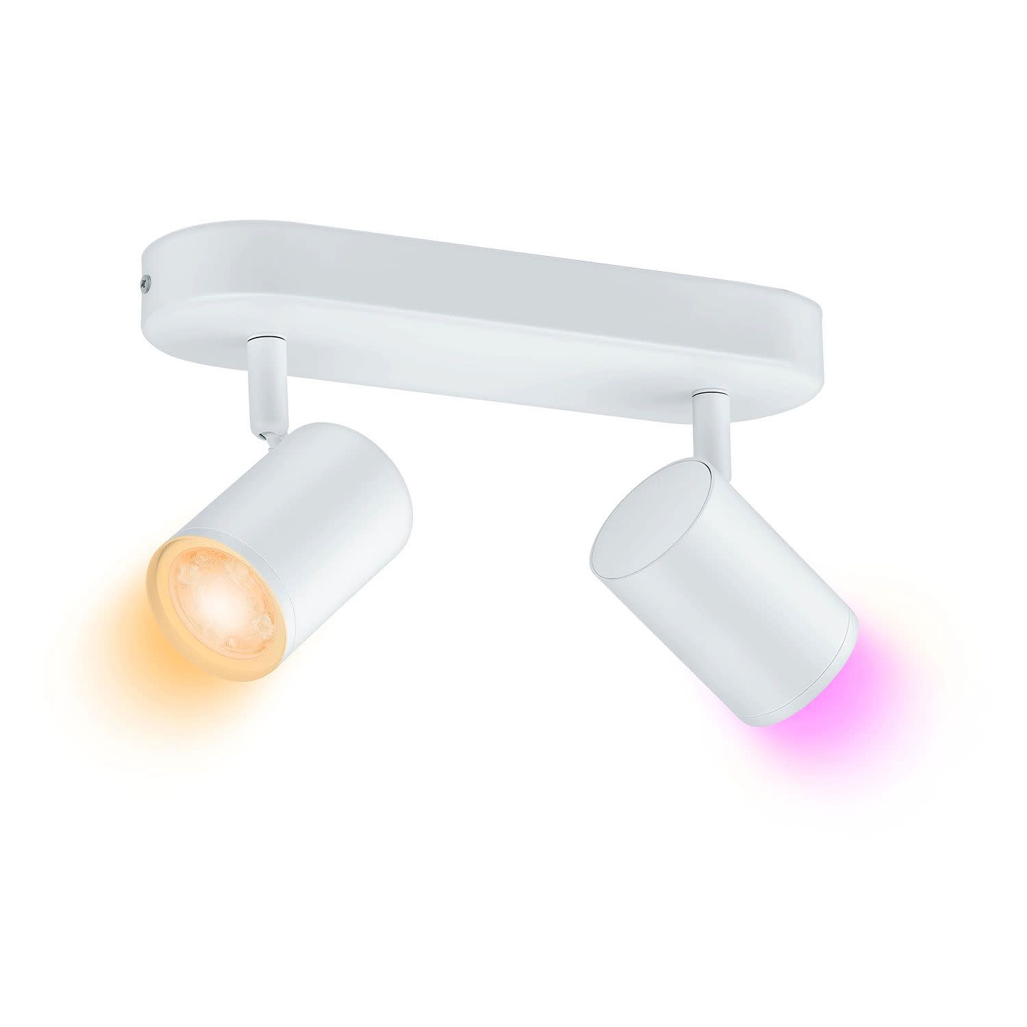 Με κομψό, μοντέρνο σχεδιασμό και μεταλλική κατασκευή, η βάση οροφής σε λευκό χρώμα με δύο έξυπνα και ρυθμιζόμενα σποτ προσφέρει πολλές διαφορετικές επιλογές για να πλημμυρίσει ο χώρος σου με υπέροχο έγχρωμο φως ή ζεστό έως ψυχρό λευκό φως (από 2.200K έως 6.500K, φωτεινότητας έως 345 lumens) και να δημιουργήσεις μία υπέροχη ατμόσφαιρα.