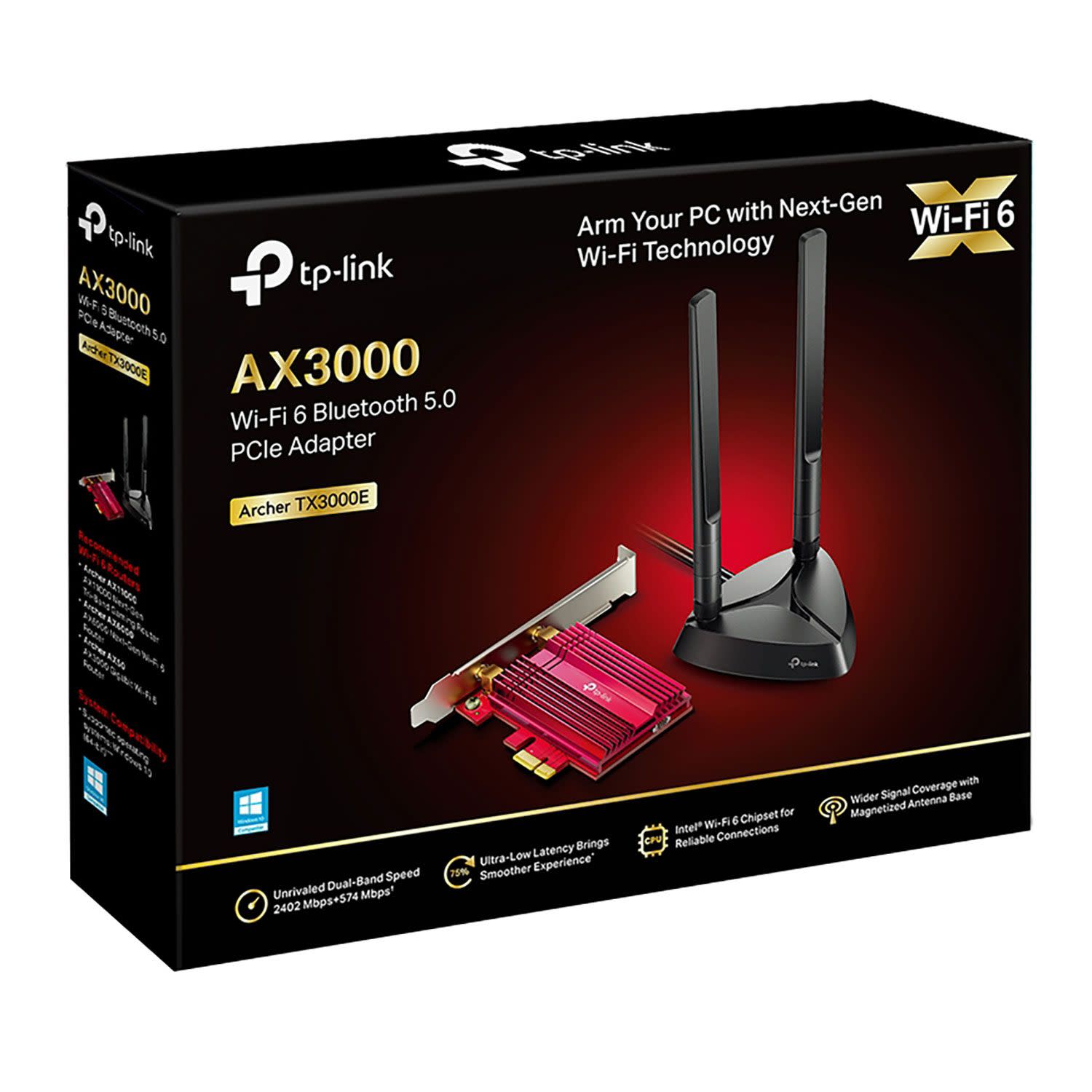 Βασισμένη στο chipset της Intel® Wi-Fi 6, η κάρτα ασύρματης δικτύωσης και Bluetooth της TP-LINK προσφέρει ταχύτερο, χωρίς παρεμβολές Wi-Fi για να ξεκλειδώσει πλήρως τις δυνατότητες του Wi-Fi 6 router σου. Έχοντας ως βάση το πρότυπο Wi-Fi 6 (802.11ax) σπάει το φράγμα «Gigabit» προσφέροντας ταχύτητες έως 2.402 Mbps (5 GHz) και 574 Mbps (2,4 GHz) που είναι ιδανικές για εξαιρετικά ομαλό και responsive real-time online gaming. Σε αυτό, βοηθάει σημαντικά και η κατά 75% χαμηλότερη υστέρηση. Χάρη επίσης στις δύο πολυκατευθυντικές κεραίες με τις βάσεις που προσαρμόζονται μαγνητικά σχεδιάστηκαν για βέλτιστη λήψη σήματος.