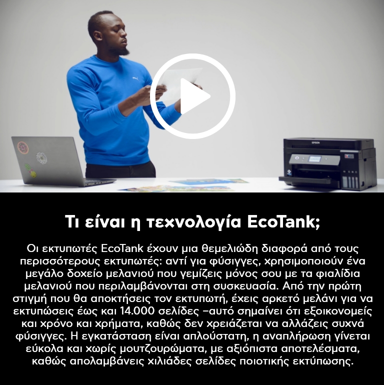 Μελάνι που καλύπτει τις ανάγκες σας έως και 3 έτη βάσει των μέσων μηνιαίων όγκων εκτύπωσης 225 σελίδων για οικιακούς εκτυπωτές και εκτυπωτές γραφείου EcoTank και 40 φωτογραφίες για φωτογραφικούς εκτυπωτές EcoTank. Οι υπολογισμοί βασίζονται στη χαμηλότερη απόδοση σελίδων φιαλιδίου μαύρου μελανιού για οικιακούς εκτυπωτές και εκτυπωτές γραφείου και στη χαμηλότερη απόδοση σελίδων φωτογραφιών για φωτογραφικούς εκτυπωτές.