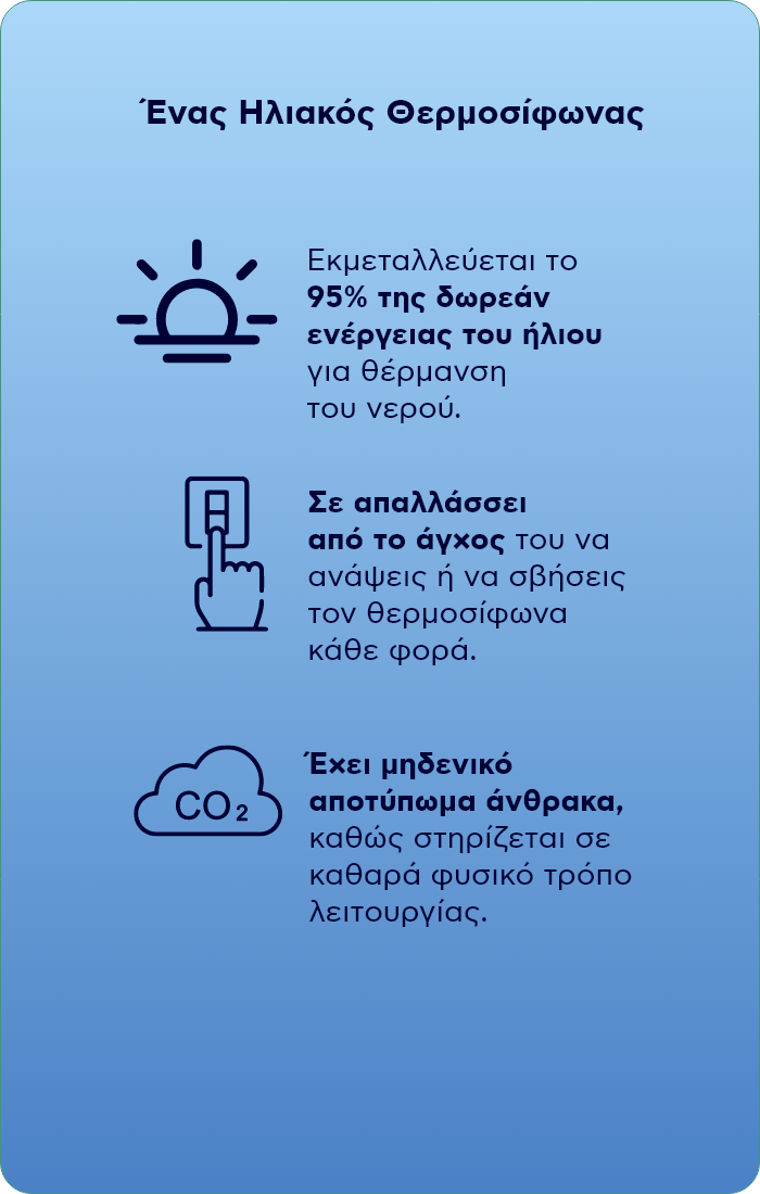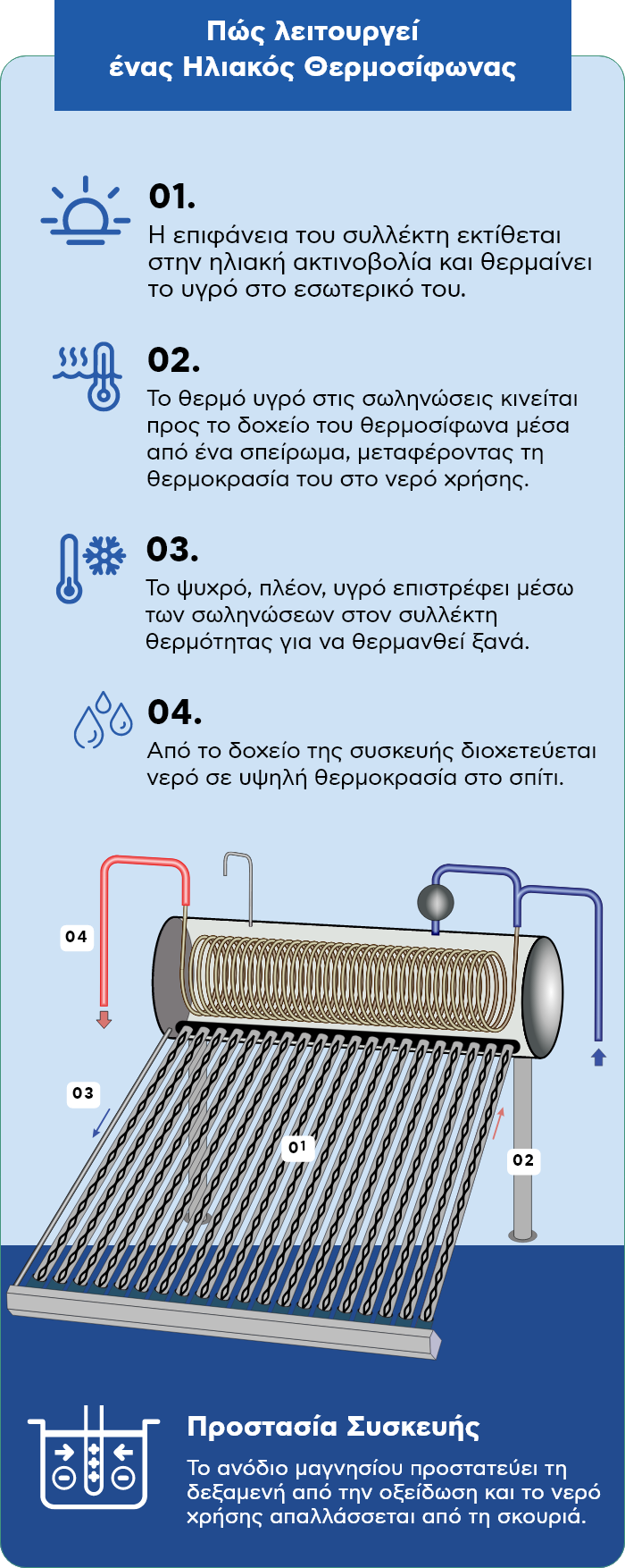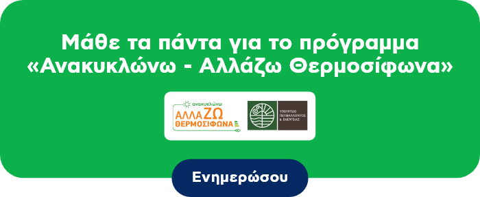 Το Πρόγραμμα «ΑΝΑΚΥΚΛΩΝΩ-ΑΛΛΑΖΩ ΘΕΡΜΟΣΙΦΩΝΑ» επιδοτεί την αντικατάσταση Ηλεκτρικών Θερμοσιφώνων με νέους Ηλιακούς Θερμοσίφωνες σύγχρονης τεχνολογίας.