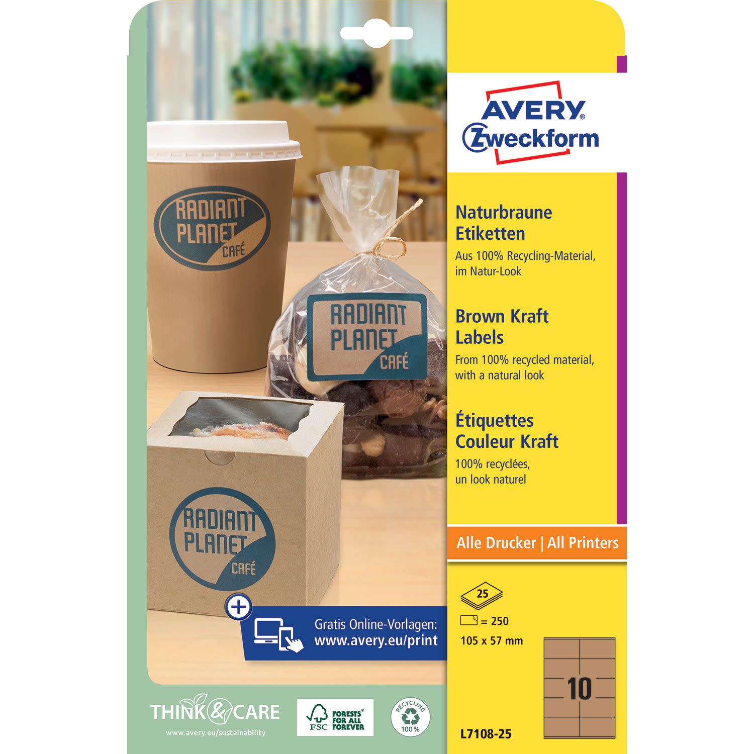 Οι ορθογώνιες, καφέ χάρτινες ετικέτες κραφτ L7108-25 σε μέγεθος 105x57mm από την AVERY ZWECKFORM δίνουν στα προϊόντα μια μοναδική και βιώσιμη εμφάνιση, ιδανική και για vintage στυλ. Οι φιλικές προς το περιβάλλον ετικέτες προϊόντων είναι κατασκευασμένες από 100% ανακυκλωμένο υλικό με πιστοποίηση FSC®. Σχεδίασε και εκτύπωσε τις ετικέτες προϊόντων γρήγορα και εύκολα με το δωρεάν πρόγραμμα της Avery Zweckform - Design&Print στη διεύθυνση www.avery-zweckform.eu/print ή με τα βασικά πρότυπα που είναι ενσωματωμένα στο πακέτο Microsoft® Office. Κατάλληλες για όλους τους τυπικούς εκτυπωτές λέιζερ και inkjet, φωτοαντιγραφικά μηχανήματα, έγχρωμους εκτυπωτές λέιζερ και έγχρωμα φωτοαντιγραφικά μηχανήματα. Είναι κατασκευασμένες απο υλικό χωρίς χλώριο και από 100% ανακυκλωμένο υλικό με πιστοποίηση FSC® και κόλλα χωρίς διαλύτες.