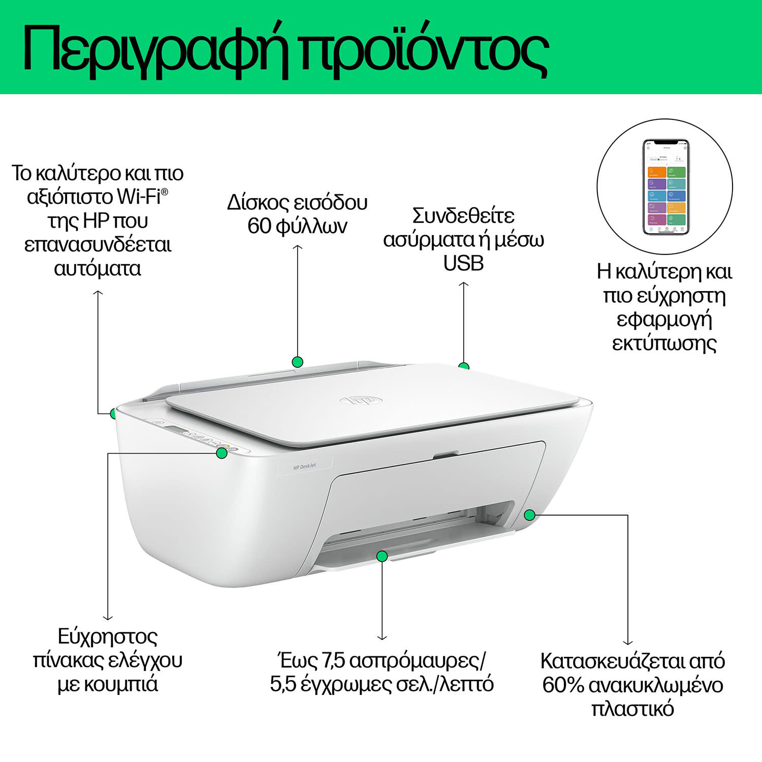 Ο νέος σου εκτυπωτής είναι κατασκευασμένος από 60% ανακυκλωμένο πλαστικό, κάνοντας τον πιο... «πράσινο» από ποτέ! Ταυτόχρονα, για κάθε σελίδα που εκτυπώνεις, η HP προστατεύει, αποκαθιστά και διαχειρίζεται τα δάση σε ανάλογο βαθμό! Ανακύκλωσε τα αυθεντικά δοχεία μελανιού HP εντελώς δωρεάν μετά τη χρήση τους, χάρη στο πρόγραμμα HP Planet Partners!