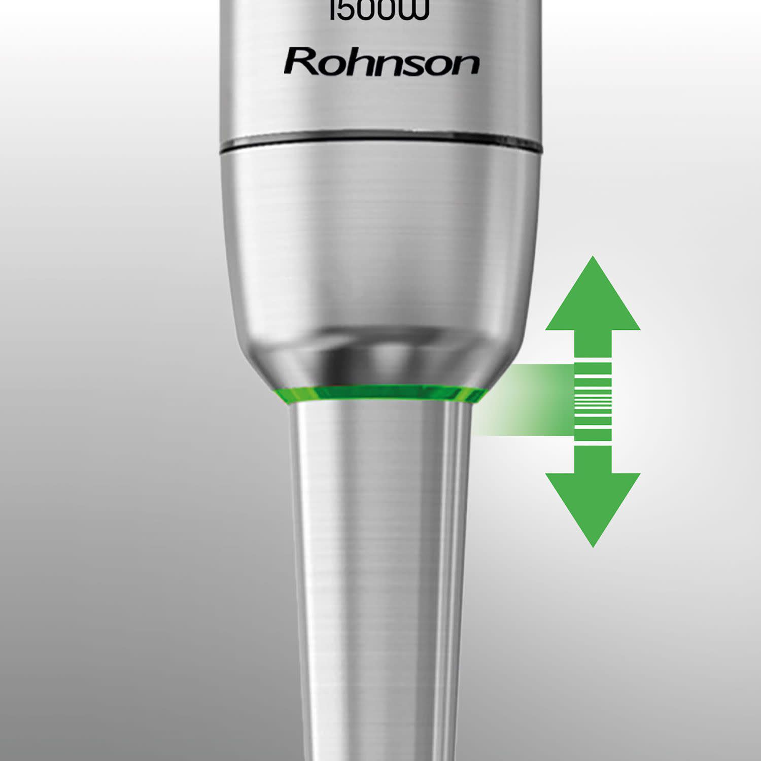 Το νέο Rohnson ραβδομπλέντερ R-5750 ανεβάζει τους «παλμούς» στην προετοιμασία των γευμάτων σου. Με 1500W, έξυπνη σκανδάλη ταχύτητας, και διπλή τεχνολογία Vario-Blade & Depth Control, οι συνταγές σου αποκτούν επαγγελματική τεχνική. Έρχεται full οργανωμένο με όλα τα απαραίτητα αξεσουάρ, που φέρνουν εις πέρας πολλές γαστρονομικές προκλήσεις, ώστε να δημιουργείς πολλαπλές παρασκευές εύκολα και γρήγορα, λείες, βελούδινες ή και crunchy υφές. Ένα μπλέντερ χειρός, που δε θα αφήνεις από τα χέρια σου!