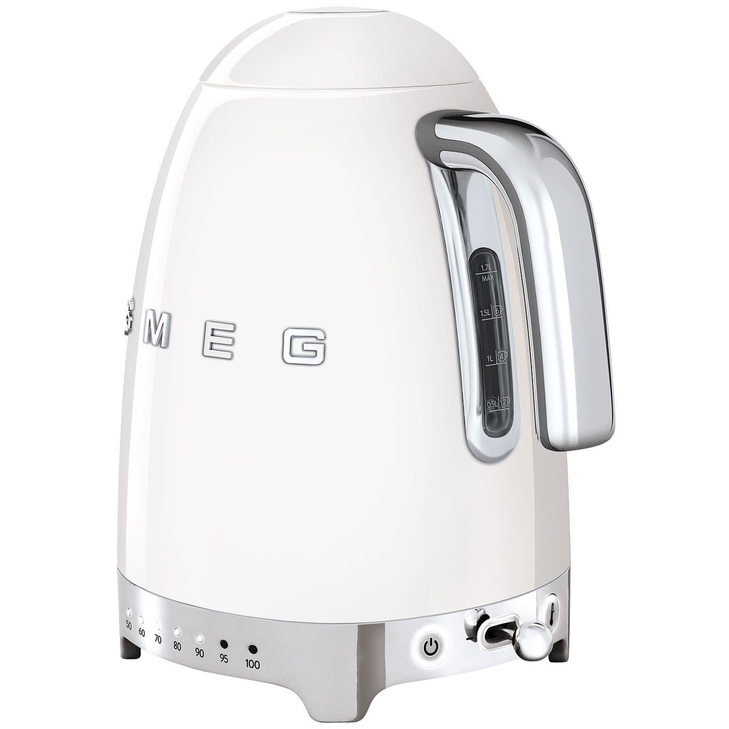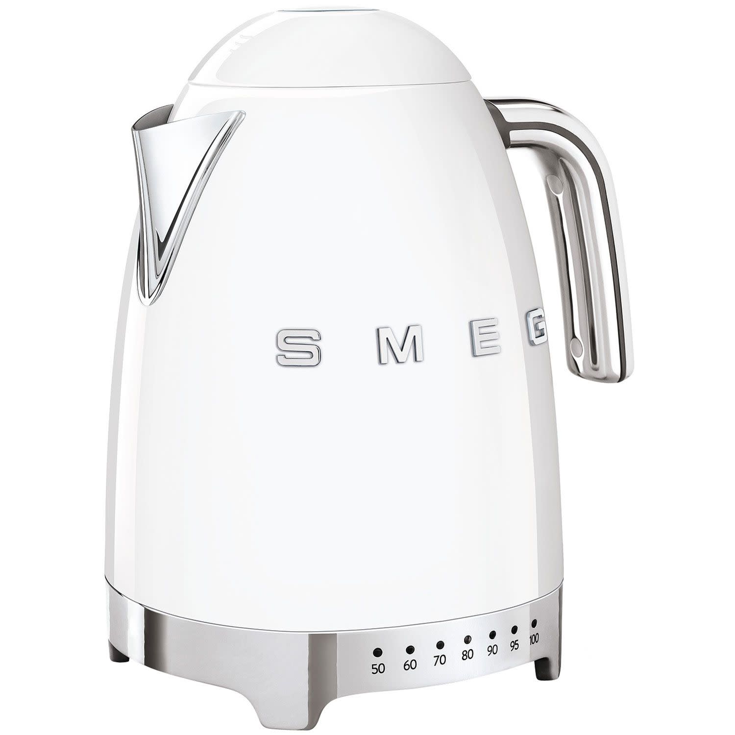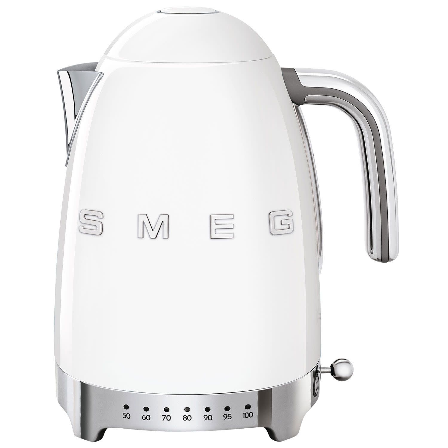 Λευκός ρυθμιζόμενος βραστήρας Smeg KLF04WHEU με ισχύ 2400W και χωρητικότητα 1.7Lt για γρήγορο βράσιμο νερού και εξοικονόμηση ενέργειας! Διασφάλισε ευελιξία στη χρήση, αφού μπορείς να επιλέξεις τη θερμοκρασία που σε εξυπηρετεί ανάμεσα στις 7 που διαθέτει η συσκευή και απόλαυσε ευκολία στην χρήση με την περιστρεφόμενη βάση 360° που διαθέτει η συσκευή σου!