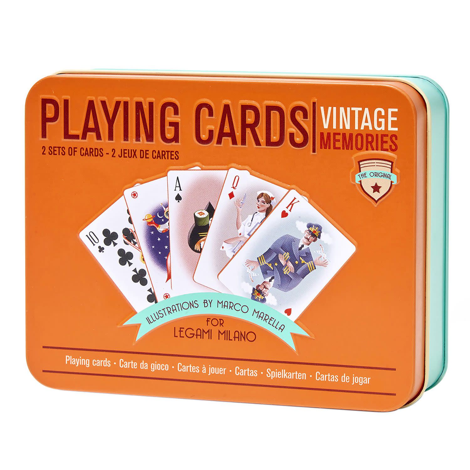 Οι τράπουλες της Legami είναι εικονογραφημένες από τον Marco Marrella και προσφέρουν ώρες διασκέδασης και ποικιλία παιχνιδιών, είτε στο σπίτι είτε έξω από αυτό. Έρχονται σε 2 σετ των 54 φύλλων, μέσα σε ένα vintage, μεταλλικό κουτί για να είναι προστατευμένες. Ιδανικές και για την παραλία ή το ταξίδι, αφού είναι 100% αδιάβροχες!