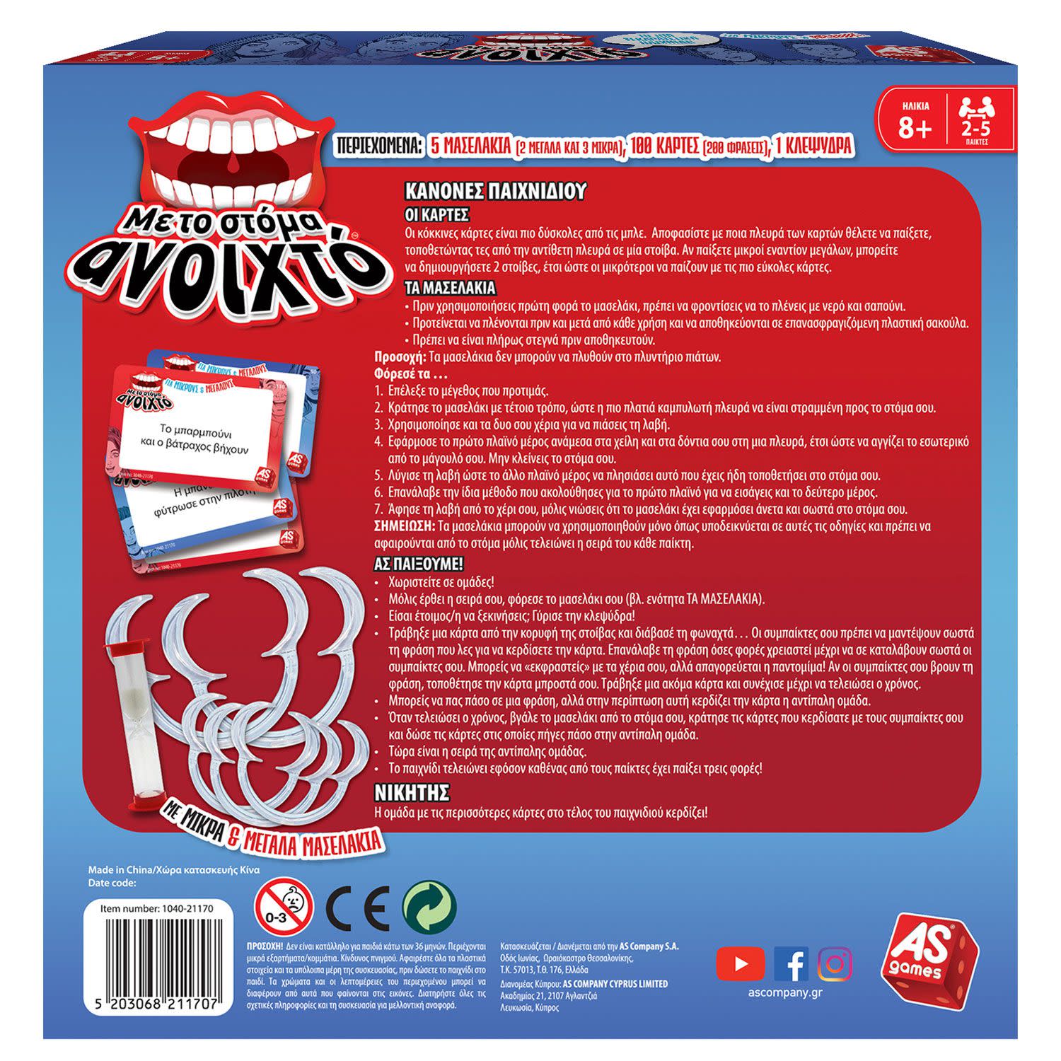 Προσπάθησε να περιγράψεις τη φράση που θέλεις «Με το Στόμα Ανοιχτό». Φόρεσε το μασελάκι σου και ξεκίνα να μιλάς. Όποια ομάδα καταφέρει να μαζέψει τις περισσότερες κάρτες, κερδίζει. Καλή διασκέδαση!