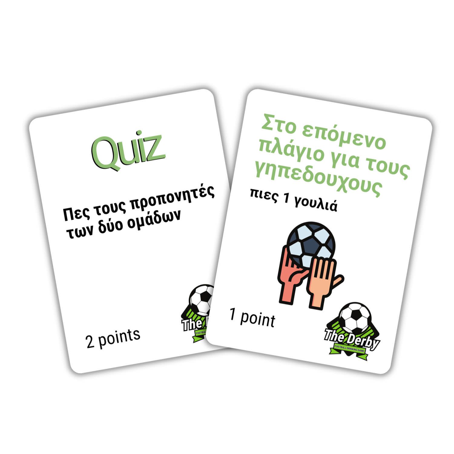 Κάθε κάρτα περιλαμβάνει ένα γεγονός που μπορεί να συμβεί κατά τη διάρκεια ενός αγώνα ποδοσφαίρου ή μια ερώτηση Quiz. Εάν συμβεί το γεγονός που εμφανίζεται στην κάρτα, ο παίκτης πρέπει να πιει τις αναγραφόμενες γουλιές, ώστε να πάρει τους πόντους της κάρτας. Εάν τραβήξει ερώτηση Quiz, τότε για να πάρει τους πόντους, ο παίκτης πρέπει να απαντήσει σωστά την ερώτηση.