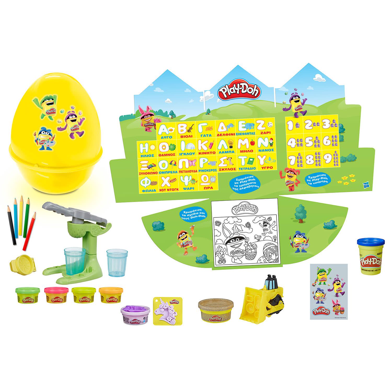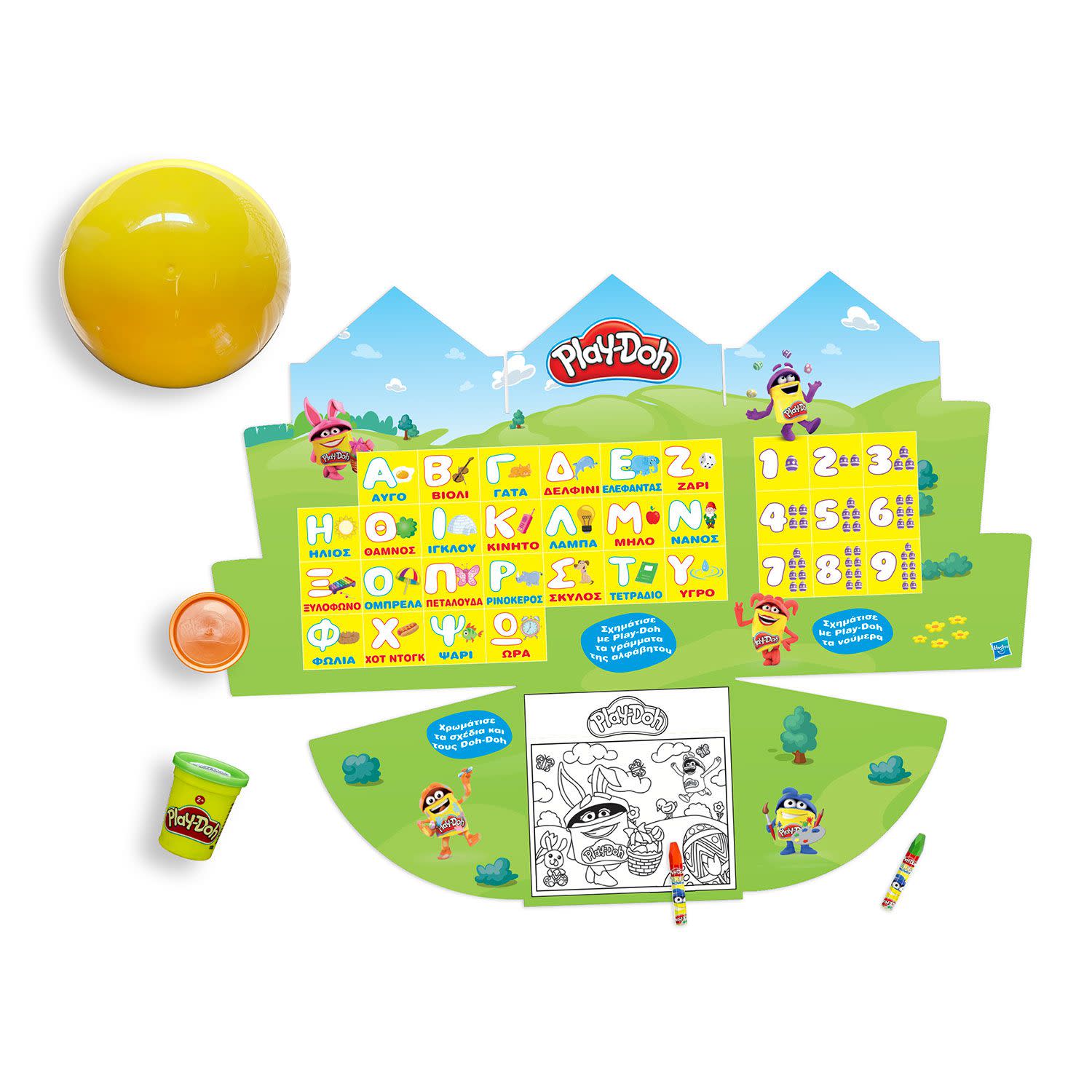 Με το αυγό Play-Doh τα μικρά θα διασκεδάσουν μαθαίνοντας την αλφάβητο και τους αριθμούς! Η συσκευασία μετατρέπεται σε ένα σετ εκπαιδευτικού παιχνιδιού, όπου τα παιδάκια μπορούν να πλάσουν τους αριθμούς με Play-Doh και να χρωματίσουν τους αξιαγάπητους Doh-Dohs. Στο εσωτερικό του κρύβει πολλές εκπλήξεις, όπως πλαστοζυμαράκι και μαρκαδόρους Play-Doh!
