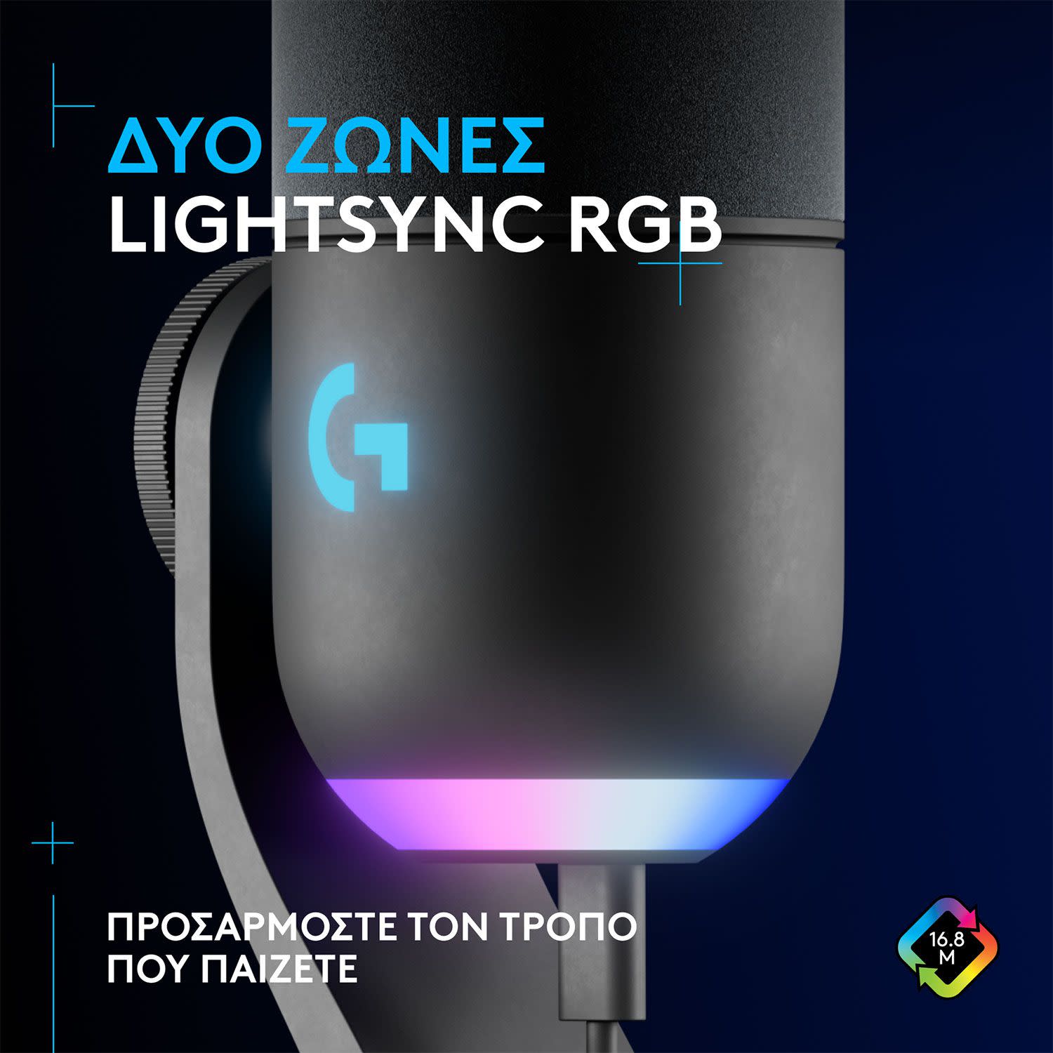 Εξαιρετικής ποιότητας, δυναμικό, υπερκαρδιοειδές μικρόφωνο RGB για gaming με τεχνολογία LIGHTSYNC, προσαρμοσμένη δυναμική κάψουλα και προηγμένο λογισμικό που προσφέρει υψηλή απόδοση ήχου μέσω USB.