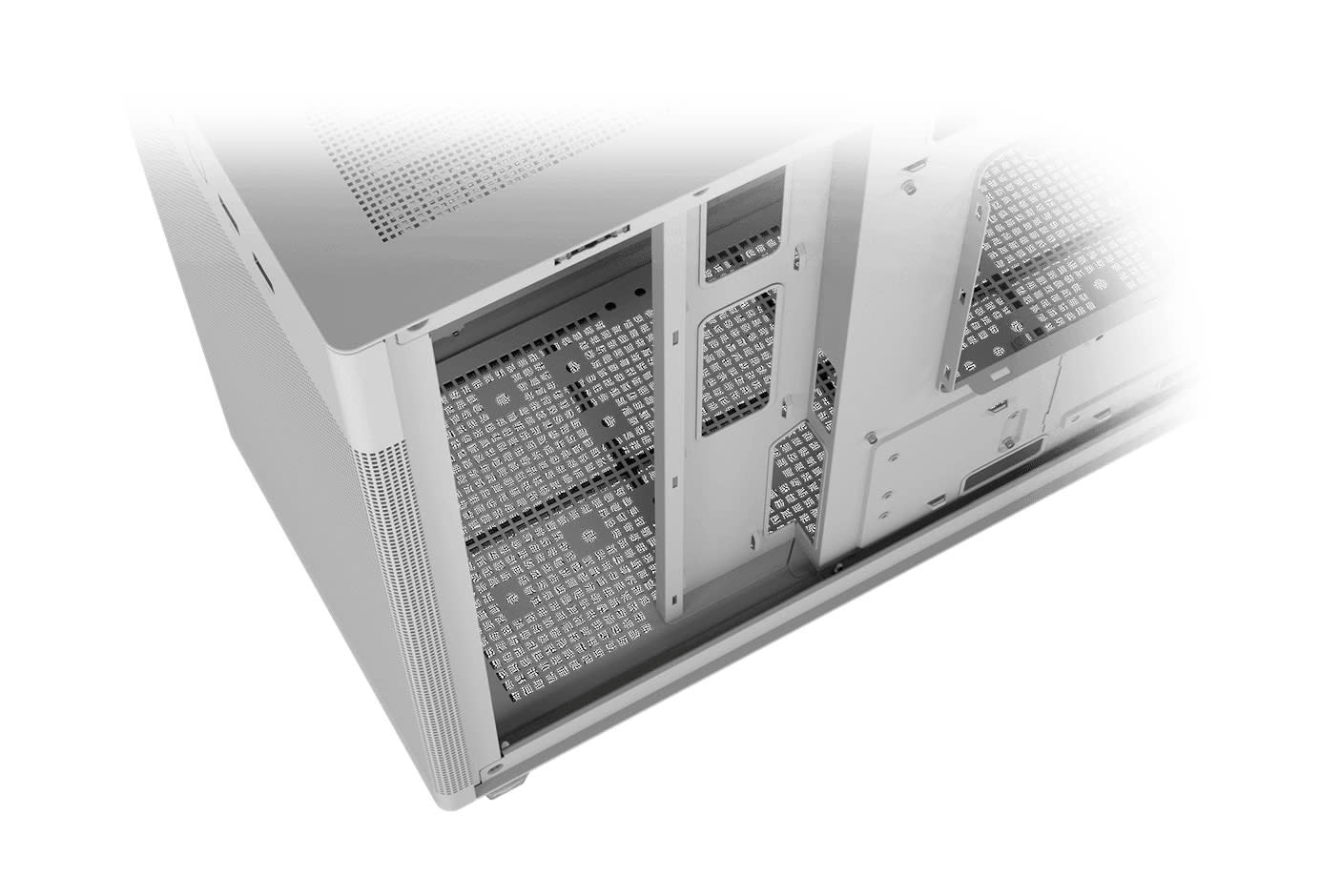 Το πρωτοποριακό mesh με 57.000 τρύπες αυξάνει την ροή αέρα και μειώνει τη σκόνη, προσφέροντας παράλληλα μοντέρνα αισθητική και πλήρη θέα στο εσωτερικό του υπολογιστή σου.