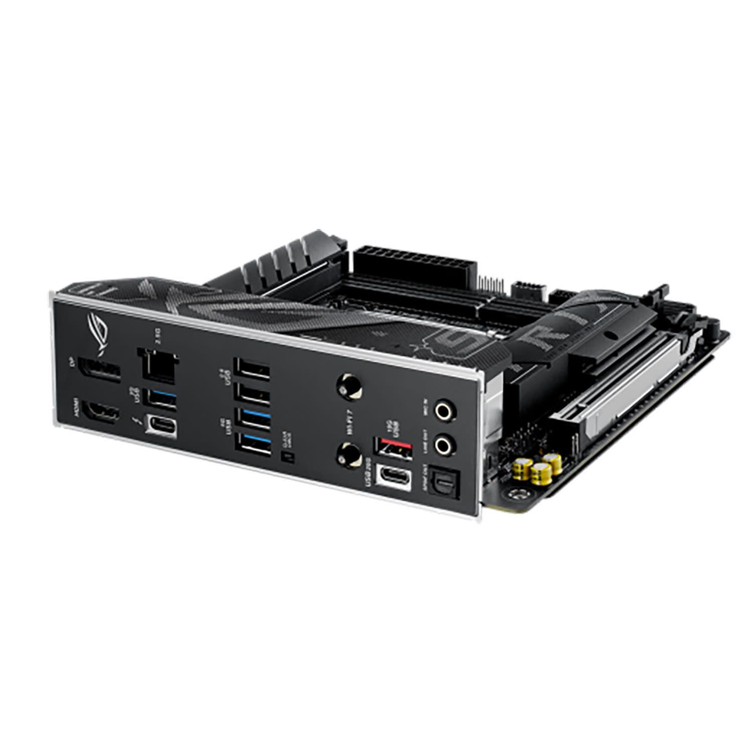 Στο πίσω ανοξείδωτο Back I/O Panel της ROG STRIX B860-I GAMING WIFI υπάρχουν 1x θύρα Thunderbolt™ 4 (USB-C), 1x θύρα USB 20Gbps (USB-C με DP Alt mode), 1x θύρα USB 10Gbps (Type-A), 3x θύρες USB 5Gbps (Type-A), 4x θύρες USB 2.0 (Type-A), 1x HDMI και 1x DisplayPort, 1x Wi-Fi Module, 1x Intel® 2.5Gb Ethernet port, 2x audio jacks, 1x ψηφιακή έξοδος ήχου (S/PDIF), καθώς και κουμπιά BIOS FlashBack™ και Clear CMOS.