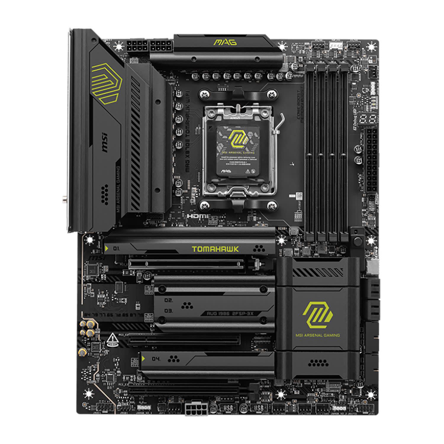 Η MAG X870E TOMAHAWK WIFI της MSI «ολοκληρώνεται» γύρω από το κορυφαίο chipset της AMD, X870E (X870 Extreme) και επομένως είναι συμβατή με τους επεξεργαστές Ryzen™ 9000-series, 8000/8000G-series και 7000-series, με τον νέο τύπο μνήμης DDR5 SDRAM (με υποστήριξη στην τεχνολογία AMD EXPO®) αλλά και με το πρότυπο PCIe® 5.0 για μονάδες αποθήκευσης στερεάς κατάστασης M.2 NVMe® PCIe® SSD και νέας γενιάς κάρτες γραφικών.