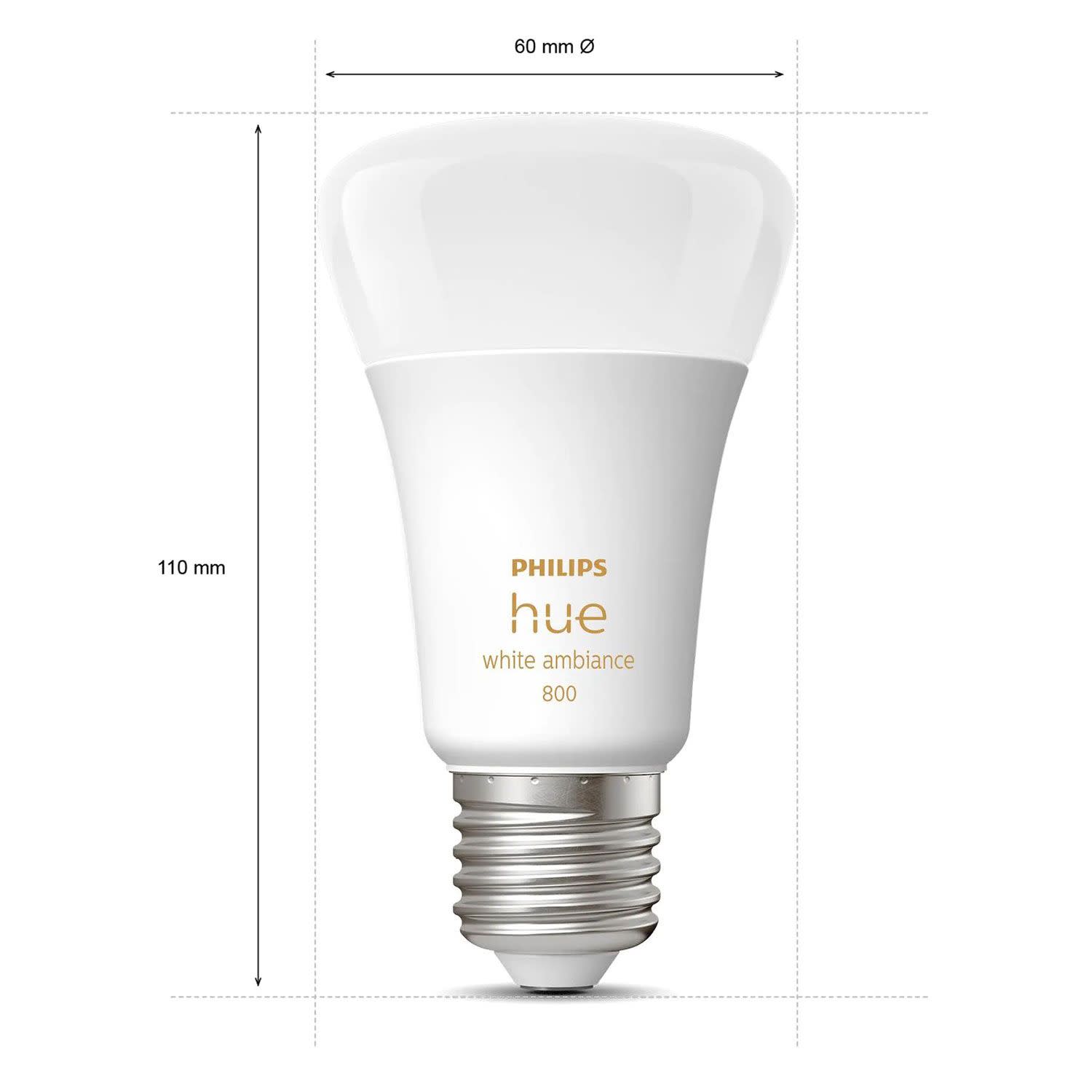 Το συγκεκριμένο σετ περιλαμβάνει δύο έξυπνους λαμπτήρες Hue White Ambiance 6W με υποδοχή E27 (φωτεινότητα 800 lumen, θερμοκρασία χρώματος 2.200K-6.500K), οι οποίοι είναι κατάλληλοι για τα περισσότερα φωτιστικά και σου δίνουν τη δυνατότητα να αποκτήσεις έξυπνο φωτισμό σε οποιοδήποτε σημείο του σπιτιού σου. Δημιούργησε αμέσως την κατάλληλη ατμόσφαιρα με εκατομμύρια αποχρώσεις λευκού φωτισμού.