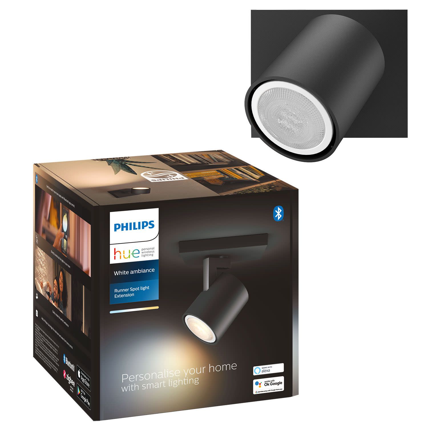 Μονό σποτ Philips Hue White ambiance Runner με ρυθμιζόμενη κεφαλή σε μαύρο χρώμα. Προσφέρει θερμό έως ψυχρό λευκό φως (περιλαμβάνεται λαμπτήρας LED GU10).