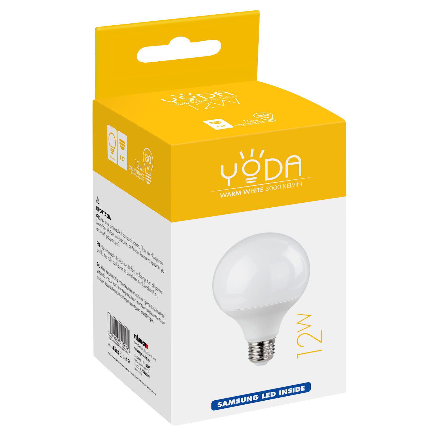 Ο λαμπτήρας YODA είναι τεχνολογίας LED και βασισμένος σε Samsung chipset προσφέροντας άμεση απόκριση, μεγάλο χρόνο ζωής και χαμηλή κατανάλωση ενέργειας. Τοποθετείτε σε ντουί E27, έχει ισχύ 12 Watts που αντιστοιχεί σε συμβατικό λαμπτήρα 90 Watts η απόδοση του, έχει σχήμα γλόμπου G95, το φως του έχει θερμοκρασία 3.000K και φωτεινότητα 1.050 Lumens.