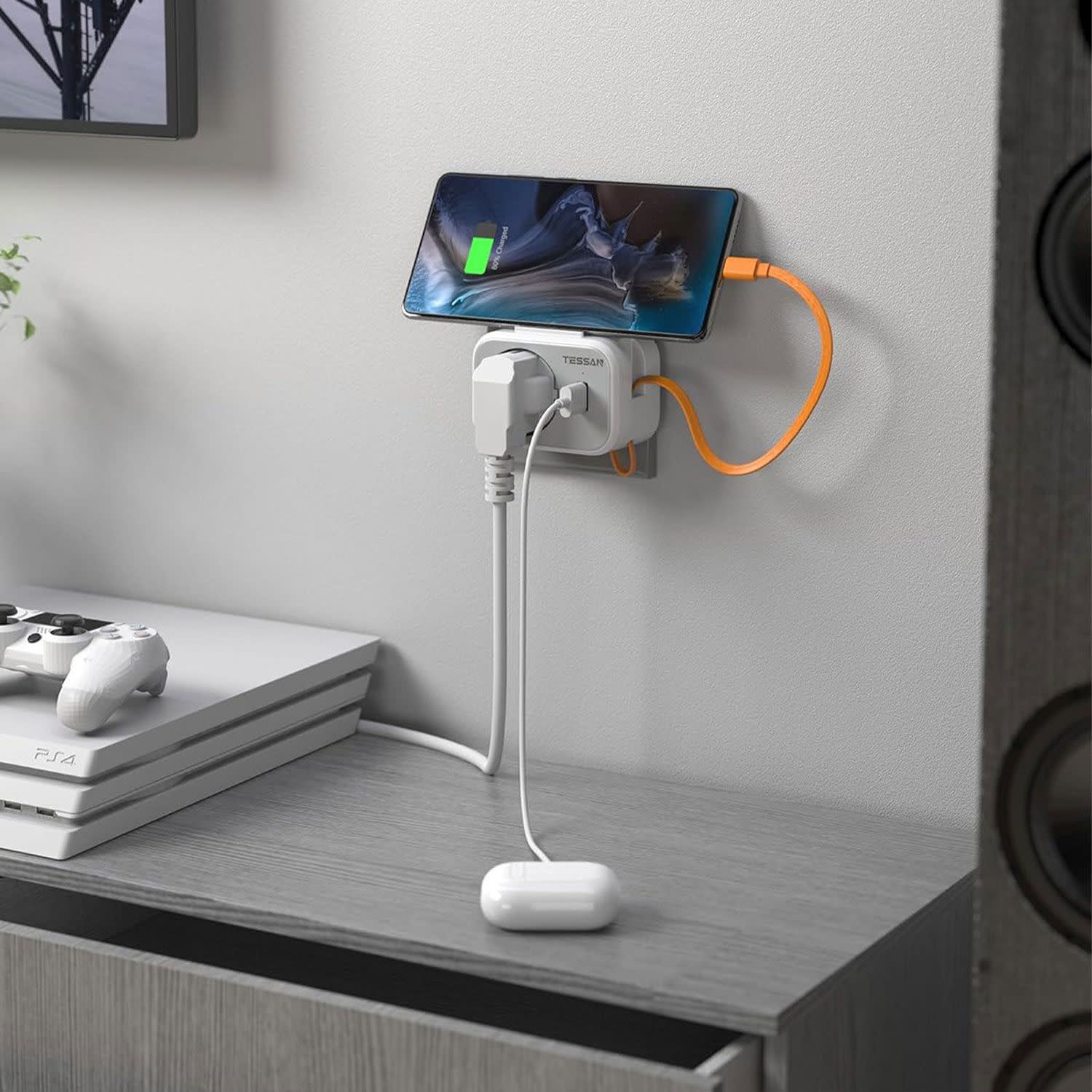 Το μονόπριζο της TESSAN (με βάρος 139 γραμμάρια και 7,5 x 5,4 x 6,2 εκατοστά) διαθέτει μία ειδική επίσης βάση για το κινητό σου τηλέφωνο καθώς φορτίζει. Η πρακτική βάση, στην οποία μπορείς να τοποθετήσεις με ασφάλεια τη συσκευή σου βοηθά ώστε να διατηρείς το γραφείο σου τακτοποιημένο. Το μονόπριζο έχει μέγιστη ονομαστική ισχύ 3600 W, η θύρα USB έχει 12 W (2,4 A) και η θύρα USB Type-C έχει ονομαστική μέγιστη ισχύ εξόδου 15 W (3 A).