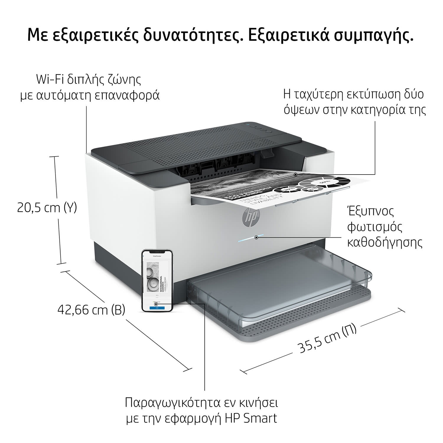 Ένας εξαιρετικά συμπαγής LaserJet που χωρά σχεδόν παντού. Είναι τόσο μικρός που μπορείς να τον τοποθετήσεις ακόμα και σε ένα γραφείο ή ράφι που ένας άλλος εκτυπωτής δεν θα χωρούσε! Εξασφάλισε μεγαλύτερη εμβέλεια, καθώς και ταχύτερες και πιο αξιόπιστες συνδέσεις με Wi-Fi™. Με αυτόν τον τρόπο, μπορείς να τον τοποθετήσεις πραγματικά όπου θες!