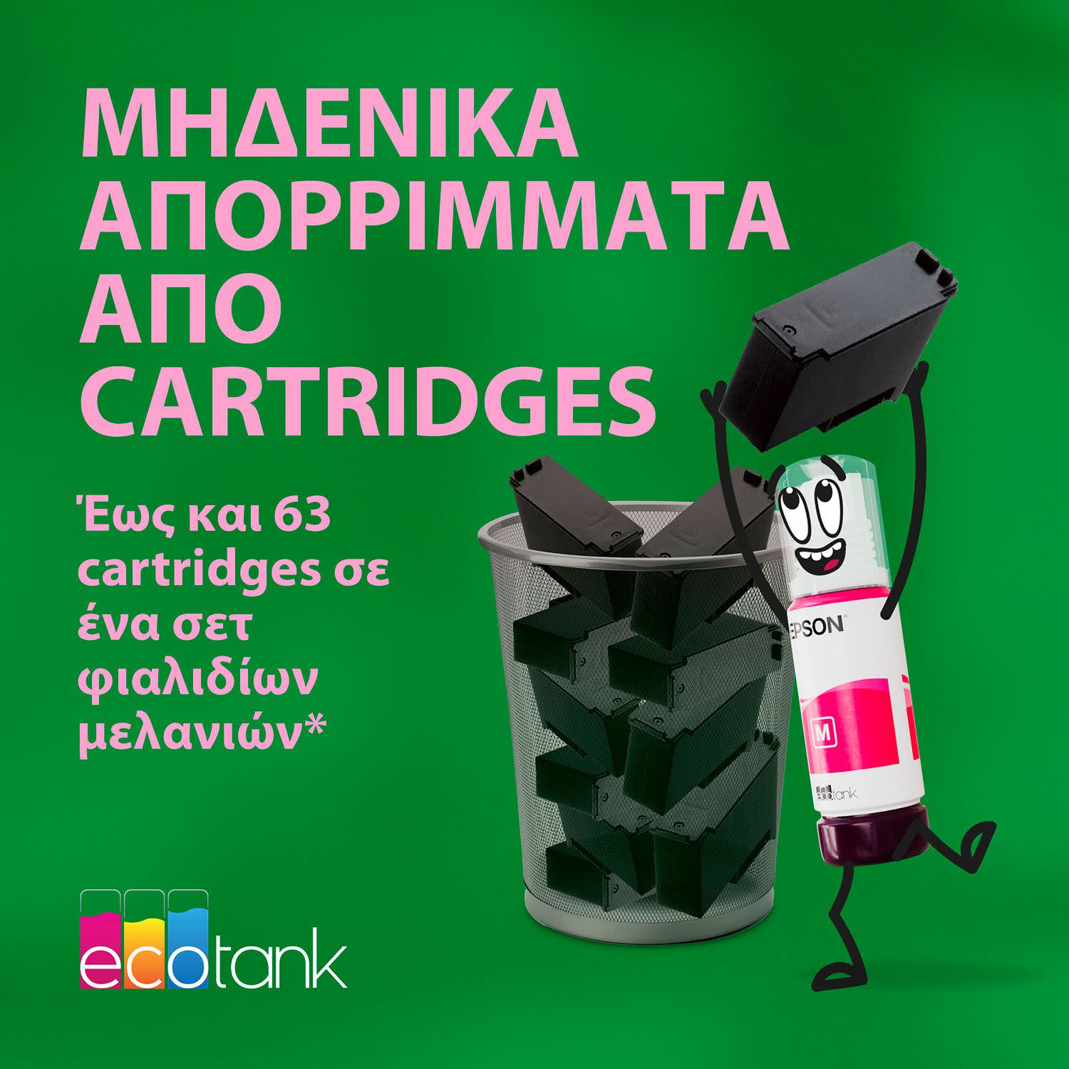 Συμπεριλαμβάνονται φιαλίδια μελανιών υψηλής απόδοσης, ενώ τα ενσωματωμένα δοχεία μελανιών μπορούν να γεμίσουν εύκολα, χάρη στα ειδικά σχεδιασμένα φιαλίδια. Καθώς δεν υπάρχουν φύσιγγες μελανιών που χρειάζονται αντικατάσταση, αυτός είναι ο ιδανικός εκτυπωτής για εκτυπώσεις υψηλής ποιότητας, με απίστευτα χαμηλό κόστος ανά σελίδα.