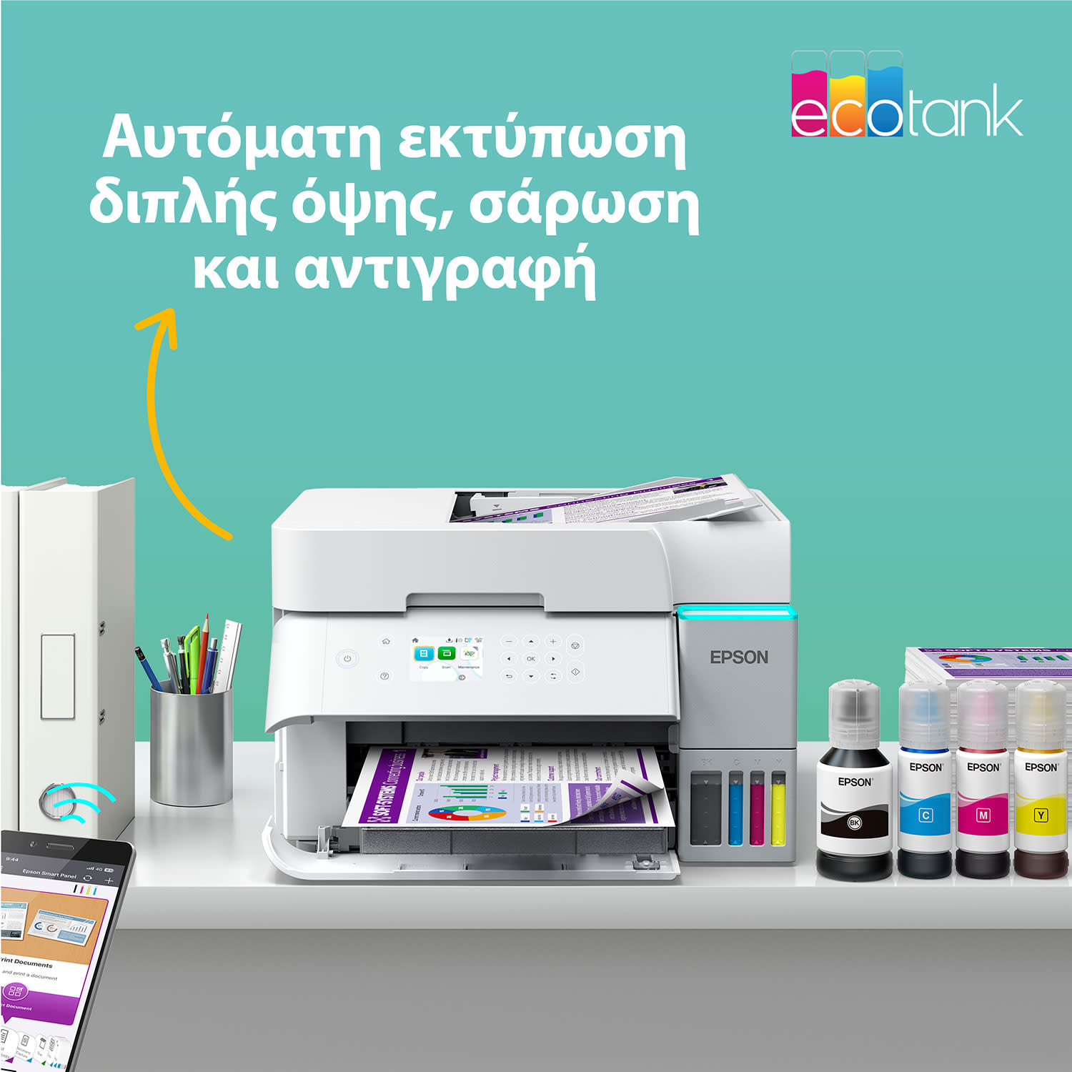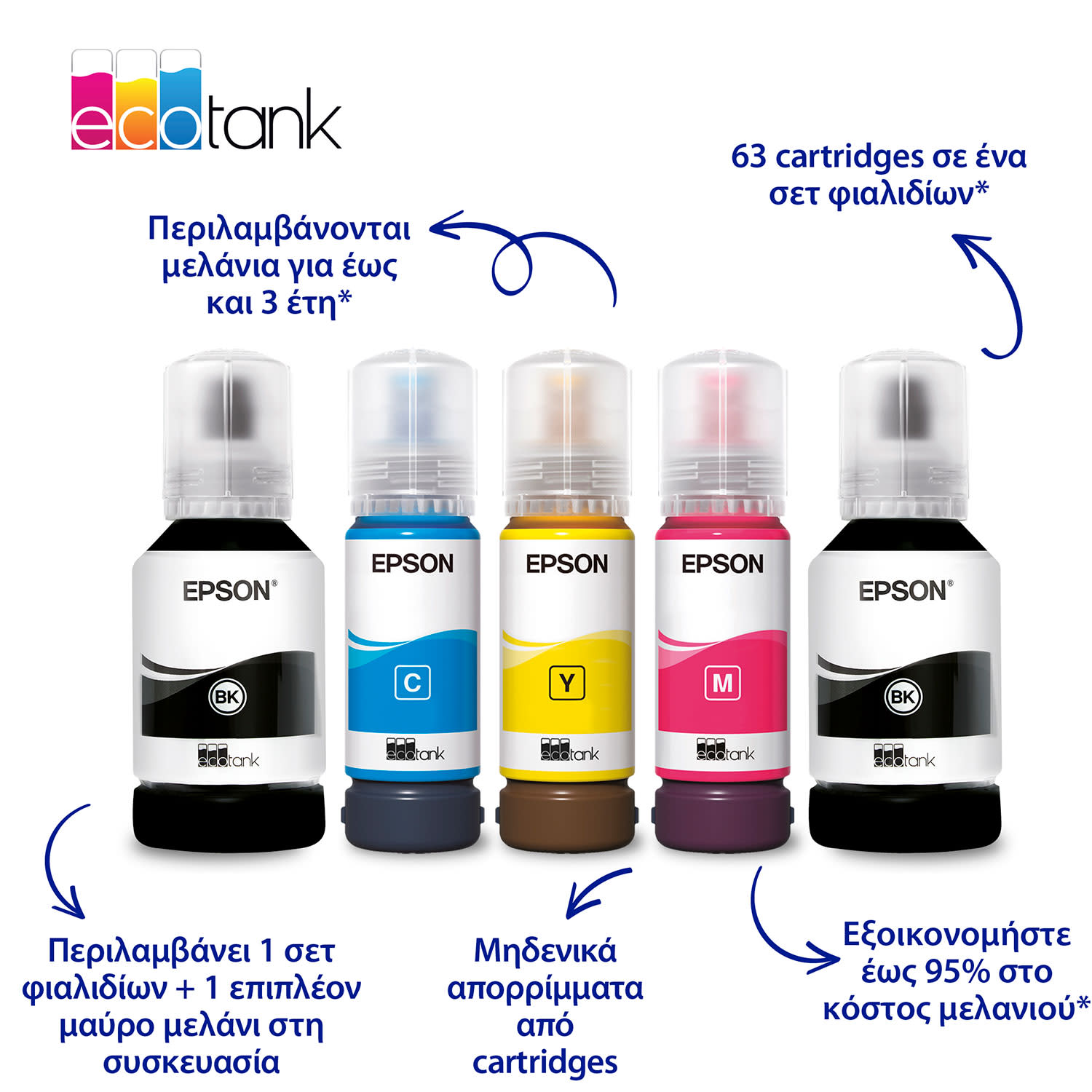 Εξοικονόμησε έως 95% στο κόστος εκτύπωσης με τους πολυλειτουργικούς εκτυπωτές EcoTank της Epson χωρίς φύσιγγες μελανιών. Συμπεριλαμβάνονται φιαλίδια μελανιών υψηλής απόδοσης, ενώ τα ενσωματωμένα δοχεία μελανιών μπορούν να γεμίσουν εύκολα, χάρη στα ειδικά σχεδιασμένα φιαλίδια. Καθώς δεν υπάρχουν φύσιγγες μελανιών που χρειάζονται αντικατάσταση, αυτός είναι ο ιδανικός εκτυπωτής για εκτυπώσεις υψηλής ποιότητας, με απίστευτα χαμηλό κόστος ανά σελίδα.