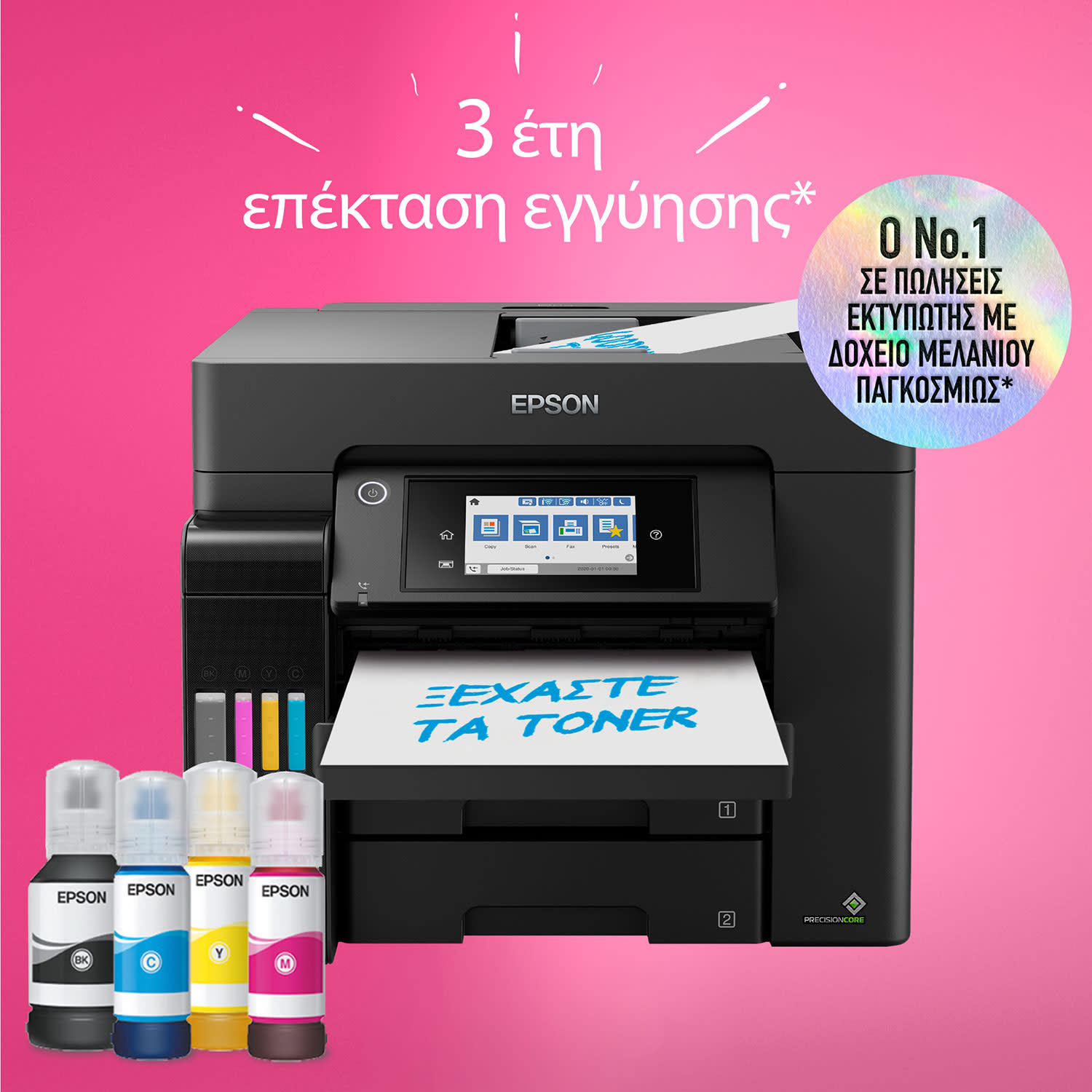 Επιπλέον, το μεγάλο μπροστινό δοχείο μελανιού γεμίζει εύκολα με τα φιαλίδια μελανιού που σφραγίζουν ξανά, είναι εύχρηστα και δεν στάζουν. Αυτός ο εκτυπωτής χρησιμοποιεί την κεφαλή εκτύπωσης PrecisionCore χωρίς θερμότητα, που είναι γνωστή για την ταχύτητα, την ποιότητα, την αξιοπιστία και την αποδοτικότητά της και διαρκεί όσο και ο εκτυπωτής.