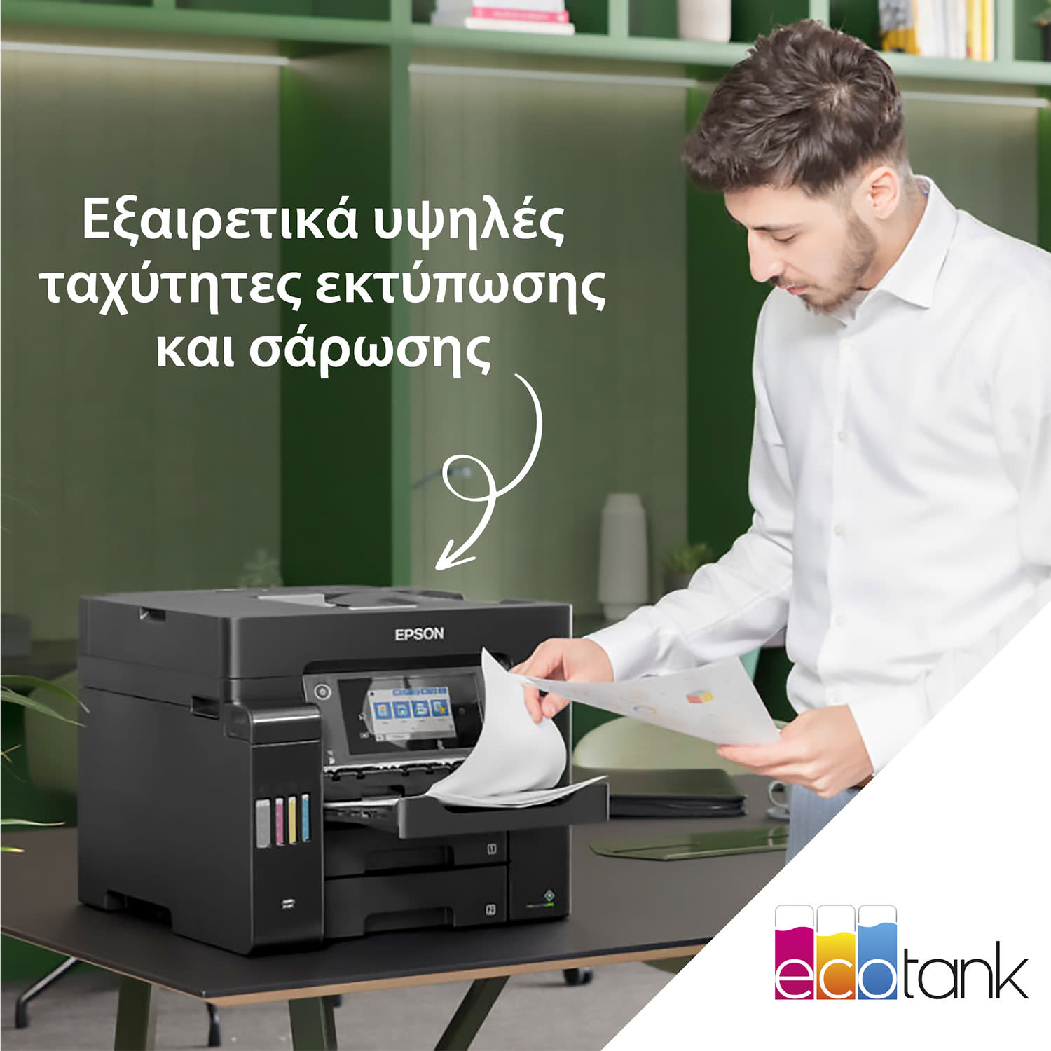 Ιδανικός για επιχειρήσεις, αυτός ο πολυλειτουργικός εκτυπωτής A4 EcoTank διαθέτει δίσκο χαρτιού χωρητικότητας 500 φύλλων, οπίσθια τροφοδοσία 50 φύλλων, αυτόματο τροφοδότη εγγράφων 50 φύλλων & φαξ.