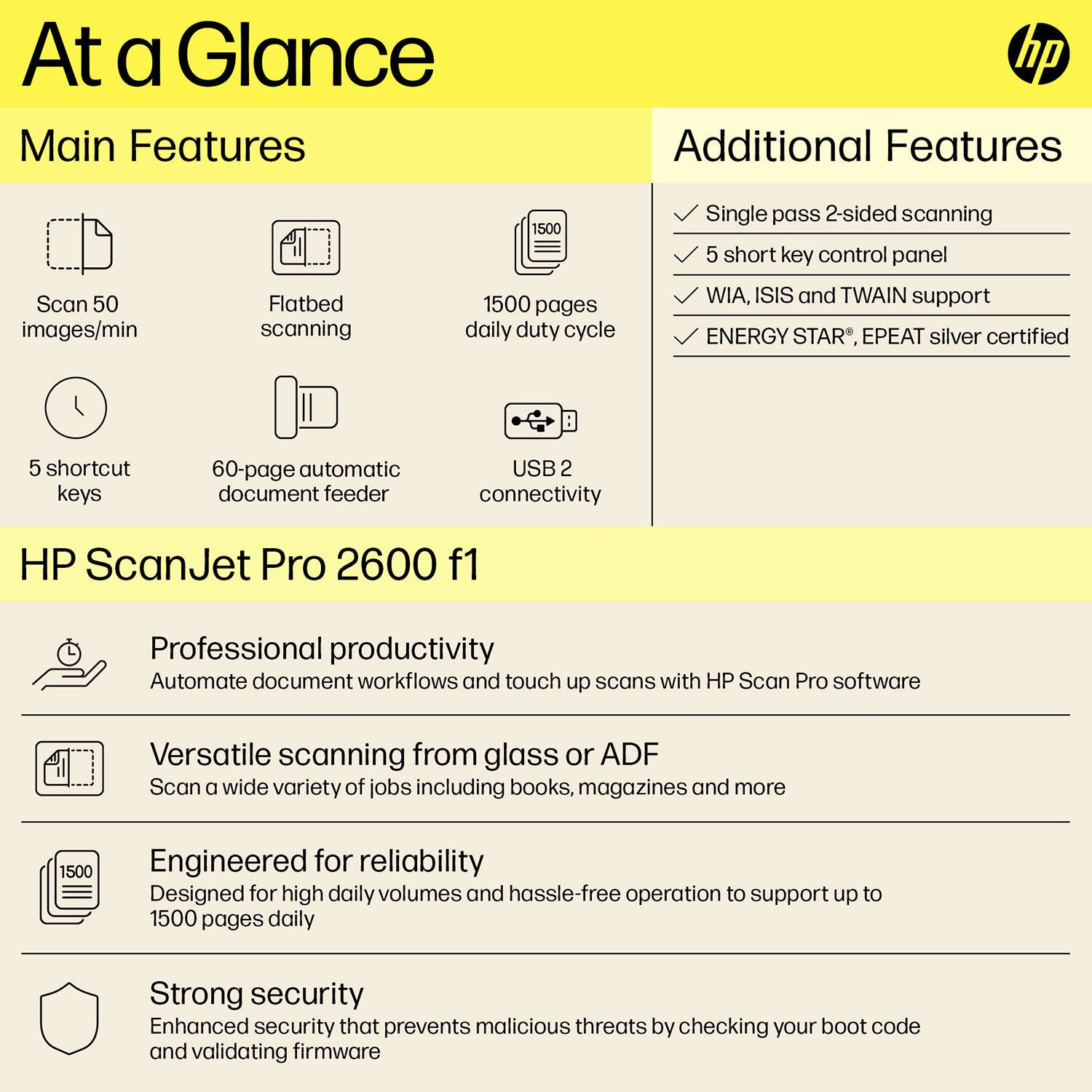 Δώσε ώθηση στην παραγωγικότητα για επαγγελματικές εργασίες σάρωσης με τον γρήγορο, εργονομικό και αξιόπιστο HP ScanJet Pro 2600 f1, που έχει σχεδιαστεί για να σαρώνει έως 1.500 σελίδες την ημέρα. Αυτοματοποίησε τις ροές εργασίας με συντομεύσεις με ένα κλικ και γρήγορη σάρωση διπλής όψης από τον αυτόματο τροφοδότη εγγράφων.