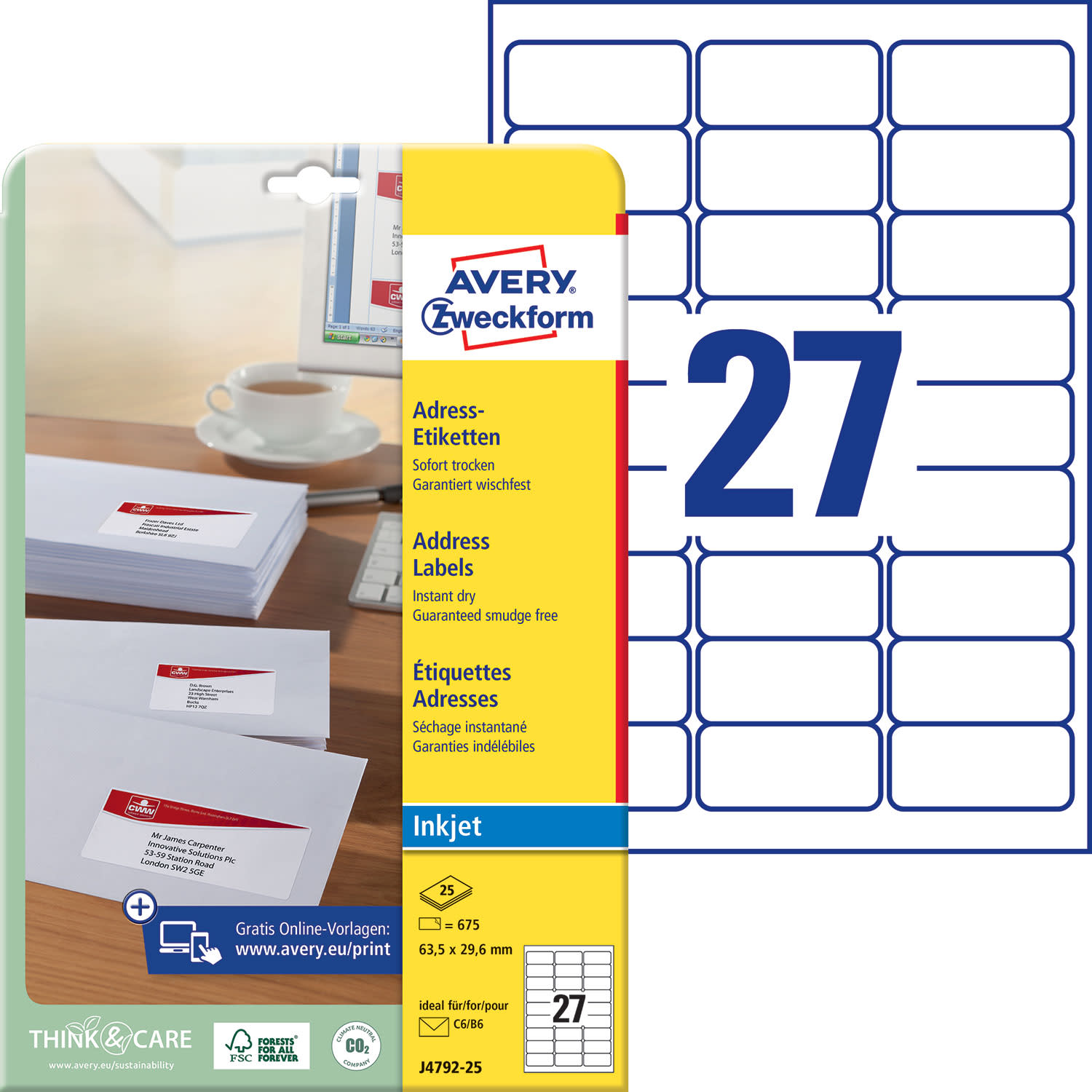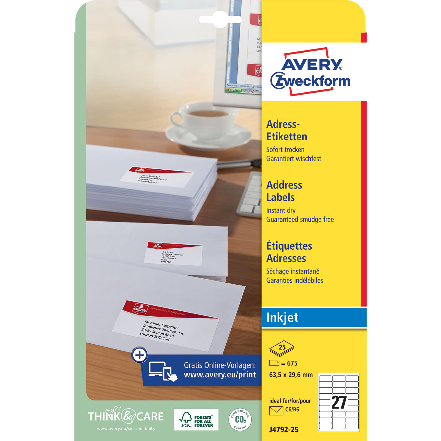 Οι λευκές, ειδικά επικαλυμμένες ετικέτες J4792-25 για εκτυπωτές inkjet σε σχήμα 63,5x29,6mm της AVERY ZWECKFORM είναι ιδανικές για την επισήμανση φακέλων C6. Η μοναδική τεχνολογία QuickDry™ εξασφαλίζει αποτελέσματα χωρίς μουτζούρες σε όλους τους τυπικούς εκτυπωτές inkjet. Σχεδίασε και εκτύπωσε τις ετικέτες με γρήγορο και εύκολο τρόπο με το δωρεάν πρόγραμμα της Avery Zweckform - Design&Print στη διεύθυνση www.avery-zweckform.eu/print ή με τα βασικά πρότυπα που είναι ενσωματωμένα στο πακέτο Microsoft® Office.