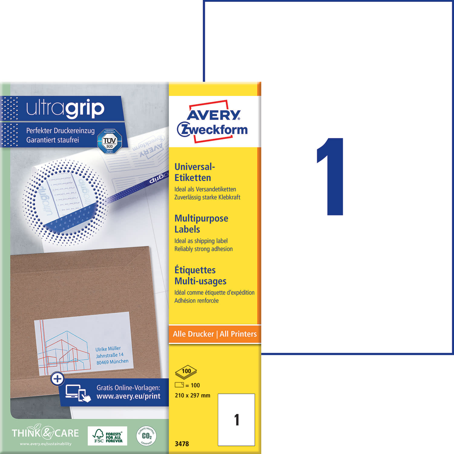 Οι λευκές, μόνιμες αυτοκόλλητες ετικέτες πολλαπλών χρήσεων σε μέγεθος 210x297mm της AVERY ZWECKFORM είναι κατάλληλες π.χ. για την επισήμανση φακέλων. Χάρη στην πρωτοποριακή τεχνολογία ultragrip μπορείς να βασιστείς οτι ο εκτυπωτής θα εχει μηδενικές εμπλοκές. Η άκρη ασφαλείας QCT αποτρέπει τα υπολείμματα κόλλας να μείνουν στον εκτυπωτή.
