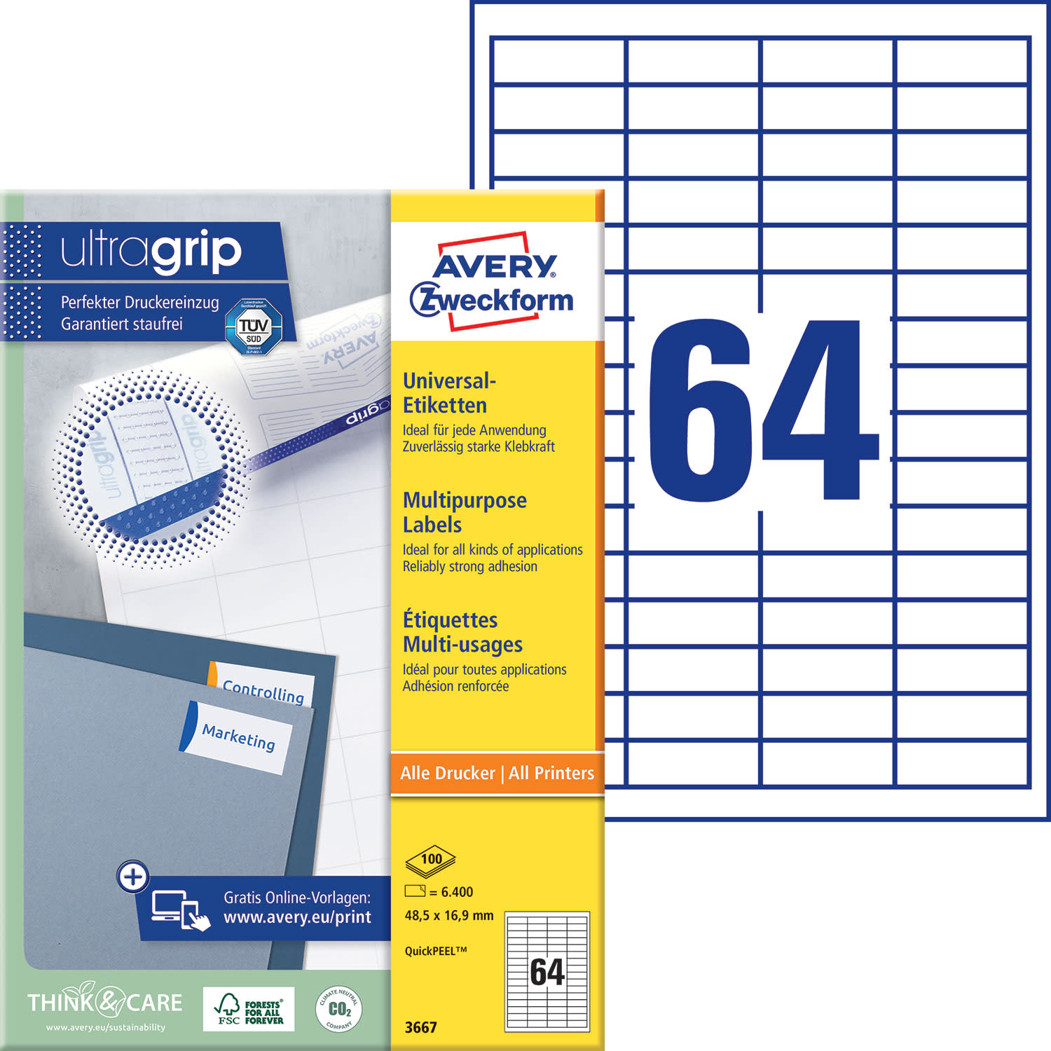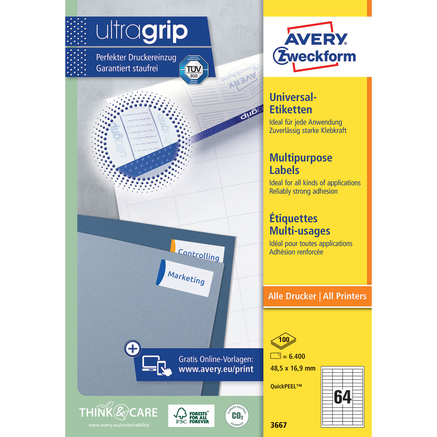 Οι λευκές, μόνιμες αυτοκόλλητες ετικέτες πολλαπλών χρήσεων σε μέγεθος 48,5x16,9 mm της AVERY ZWECKFORM είναι κατάλληλες π.χ. για διορθώσεις και παρατηρήσεις. Χάρη στην πρωτοποριακή τεχνολογία ultragrip ο εκτυπωτής θα εχει μηδενικές εμπλοκές. Η άκρη ασφαλείας QCT αποτρέπει τα υπολείμματα κόλλας να μείνουν στον εκτυπωτή. Εκτύπωση σε εκτυπωτές λέιζερ δοκιμασμένη και επιβεβαιωμένη από την TÜV SÜD. Μπορούν να χρησιμοποιηθούν σε χαρτί, χαρτόνι, γυαλί και πλαστικό. Οι ετικέτες είναι φιλικές προς το περιβάλλον και πιστοποιημένες με FSC®. Σχεδίασε κααι εκτύπωσε τις ετικέτες εύκολα και γρήγορα με το δωρεάν πρόγραμμα της Avery Zweckform - Design&Print στη διεύθυνση www.avery-zweckform.eu/print ή με τα βασικά πρότυπα που είναι ενσωματωμένα στο πακέτο Microsoft® Office. Κατάλληλες για όλους τους τυπικούς εκτυπωτές λέιζερ, inkjet και φωτοτυπικά μηχανήματα.