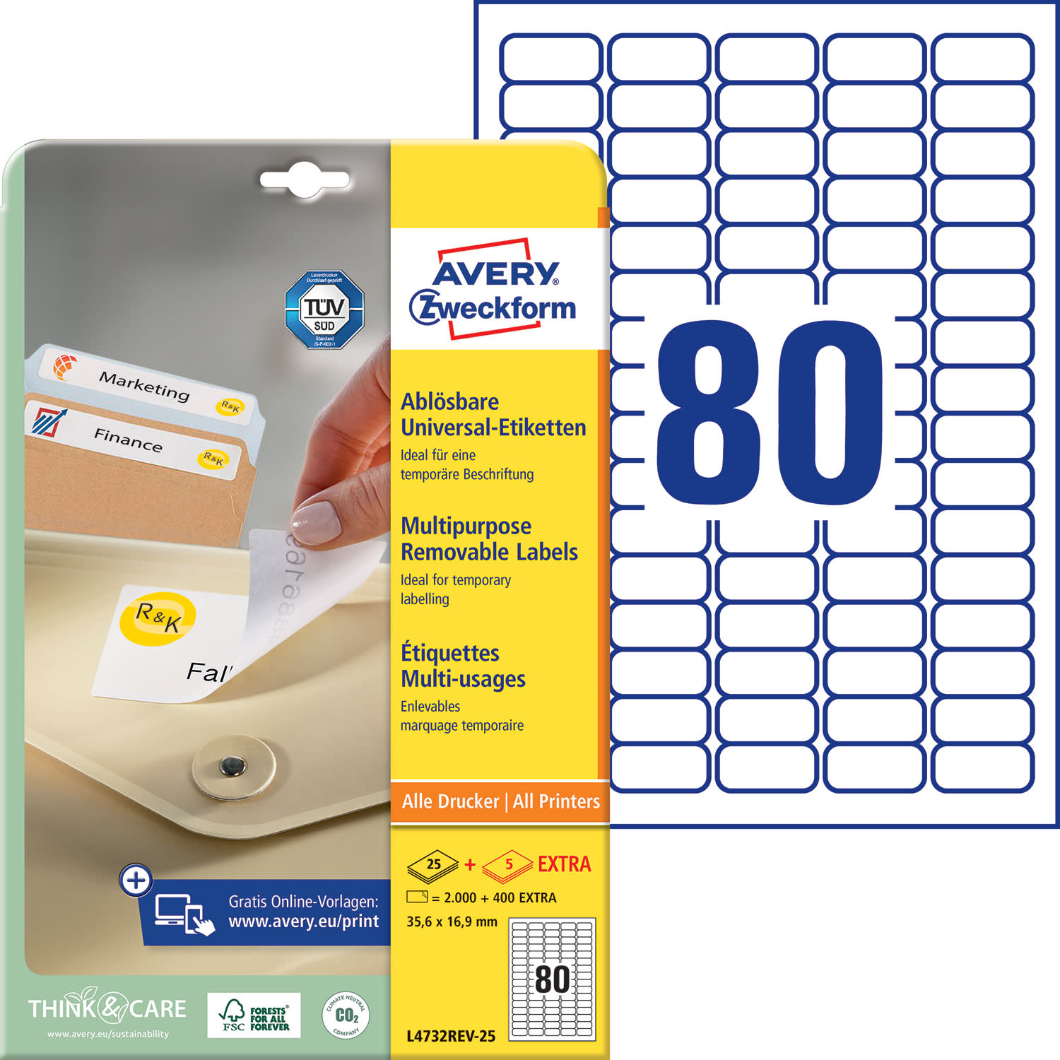 Οι λευκές, αφαιρούμενες ετικέτες πολλαπλών χρήσεων L4732REV-25 C27 σε μέγεθος 35,6x16,9mm της AVERY ZWECKFORM είναι ιδανικές για την τιμολόγηση και την επισήμανση προϊόντων. Κολλάνε αξιόπιστα και αφαιρούνται χωρίς να αφήνουν υπολείμματα στην επιφάνεια. Βασίσου σε εκτύπωση χωρίς εμπλοκές και χωρίς να μένουν υπολείμματα κόλλας στον εκτυπωτή. Ανεμπόδιστη εκτύπωση για εκτυπωτές λέιζερ, δοκιμασμένες και πιστοποιημένες από την TÜV SÜD. Οι ετικέτες πολλαπλών χρήσεων προσφέρουν την τέλεια ετικέτα για κάθε ανάγκη με ευκρινή εικόνα και χωρίς μουτζούρες. Φιλικές προς το περιβάλλον, πιστοποιημένες με FSC® και λευκασμένες χωρίς χλώριο.