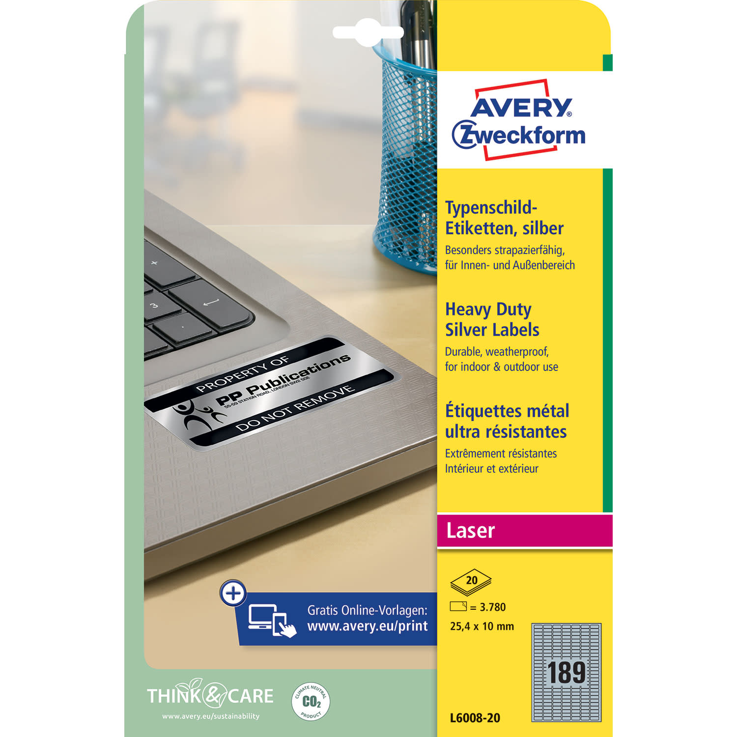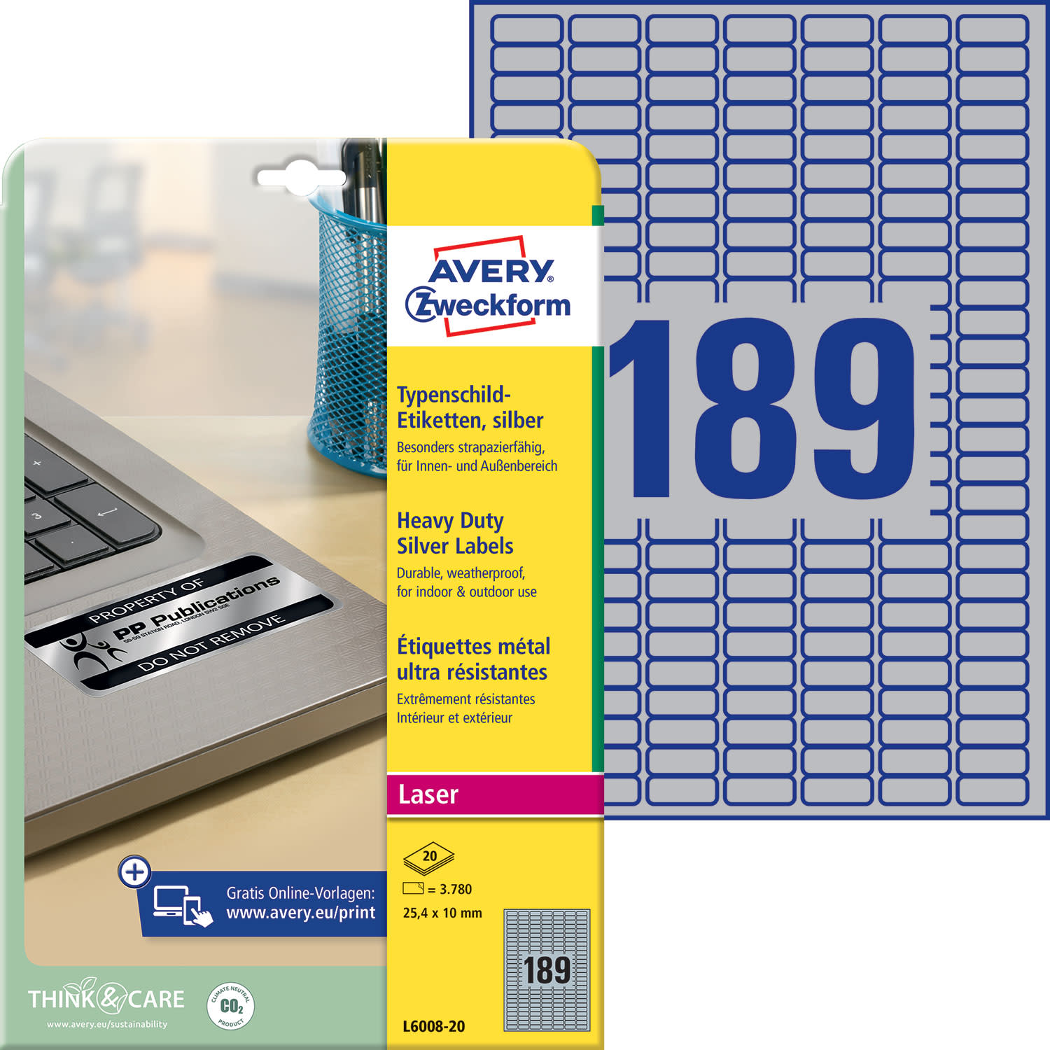 Οι ασημένιες ετικέτες βαρέως τύπου L6108-20 με μέγεθος 25,4x10mm της AVERY ZWECKFORM αναπτύχθηκαν ειδικά για την αξιόπιστη και επαγγελματική χρήση. Οι βαρέως τύπου ετικέτες φιλμ πολυεστέρα είναι ανθεκτικές σε λάδι, βρωμιά, υπεριώδη ακτινοβολία, στις θερμοκρασίες -40°C έως +150°C και ανθεκτικές στο νερό και το σχίσιμο. Ακόμα, είναι ιδανικές για την σήμανση περιουσιακών στοιχείων εταιρειών, όπως ηλεκτρονικές συσκευές και εξαρτήματα. Σχεδίασε και εκτύπωσε τις ασημένιες ετικέτες βαρέως τύπου με γρήγορο και εύκολο τρόπο με το δωρεάν πρόγραμμα της Avery Zweckform - Design&Print στη διεύθυνση www.avery-zweckform.eu/print ή με τα βασικά πρότυπα που είναι ενσωματωμένα στο πακέτο Microsoft® Office. Βέλτιστη καταλληλότητα για εκτυπωτές λέιζερ. Οι ετικέτες από φιλμ παράγονται με κλιματικά ουδέτερο τρόπο.