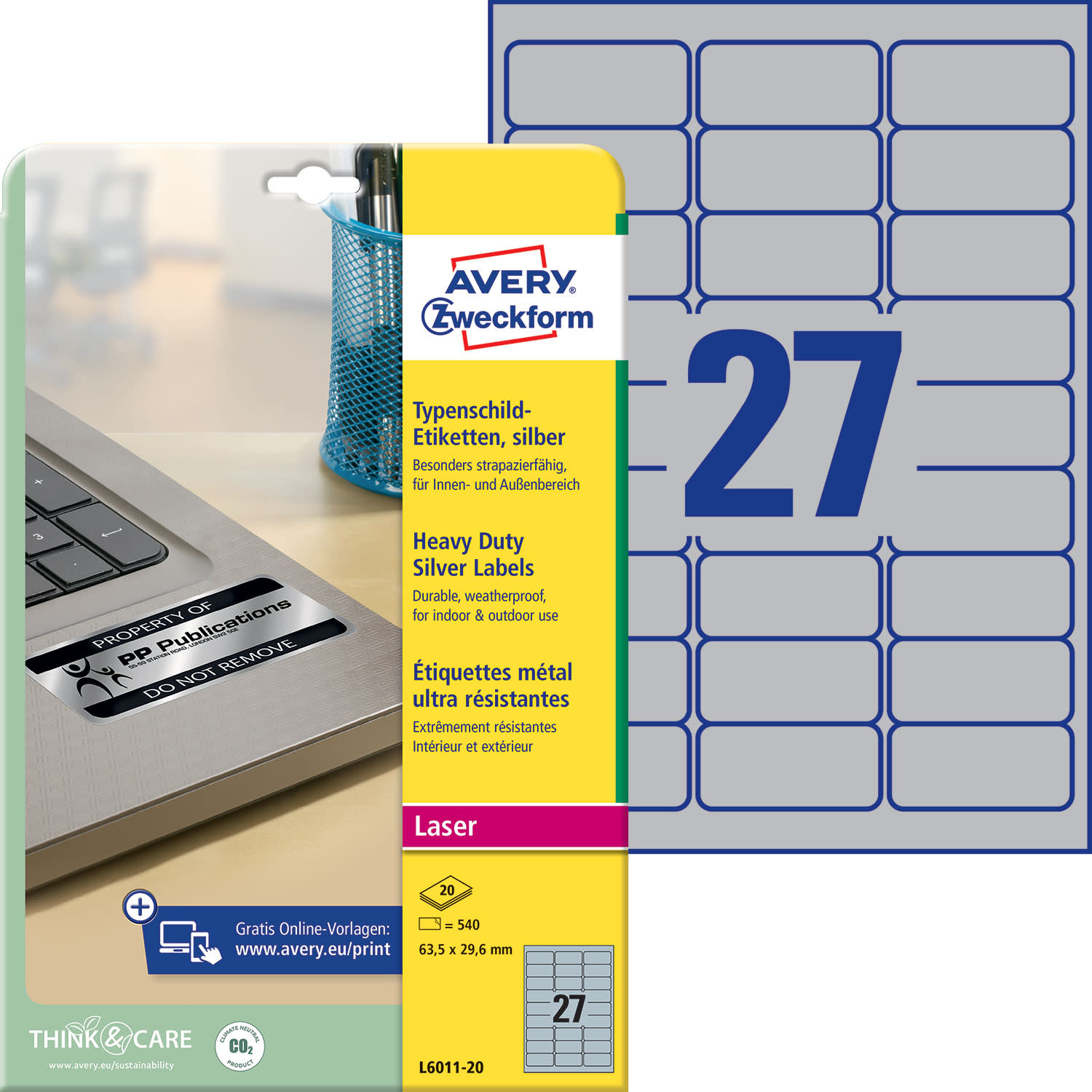 Οι ασημένιες ετικέτες βαρέως τύπου L6011-20 με μέγεθος 63,5x29,6mm της AVERY ZWECKFORM αναπτύχθηκαν ειδικά για την αξιόπιστη και επαγγελματική χρήση. Οι βαρέως τύπου ετικέτες μεμβράνης πολυεστέρα είναι ανθεκτικές σε λάδι, βρωμιά, υπεριώδη ακτινοβολία, στις θερμοκρασίες -40°C έως +150°C και ανθεκτικές στο νερό και το σχίσιμο. Ακόμα, είναι ιδανικές για την σήμανση περιουσιακών στοιχείων εταιρειών, όπως ηλεκτρονικές συσκευές και εξαρτήματα. Σχεδίασε και εκτύπωσε τις ετικέτες με γρήγορο και εύκολο τρόπο με το δωρεάν πρόγραμμα της Avery Zweckform - Design&Print στη διεύθυνση www.avery-zweckform.eu/print ή με τα βασικά πρότυπα που είναι ενσωματωμένα στο πακέτο Microsoft® Office. Βέλτιστη καταλληλότητα για εκτυπωτές λέιζερ. Οι ετικέτες από φιλμ παράγονται με κλιματικά ουδέτερο τρόπο.