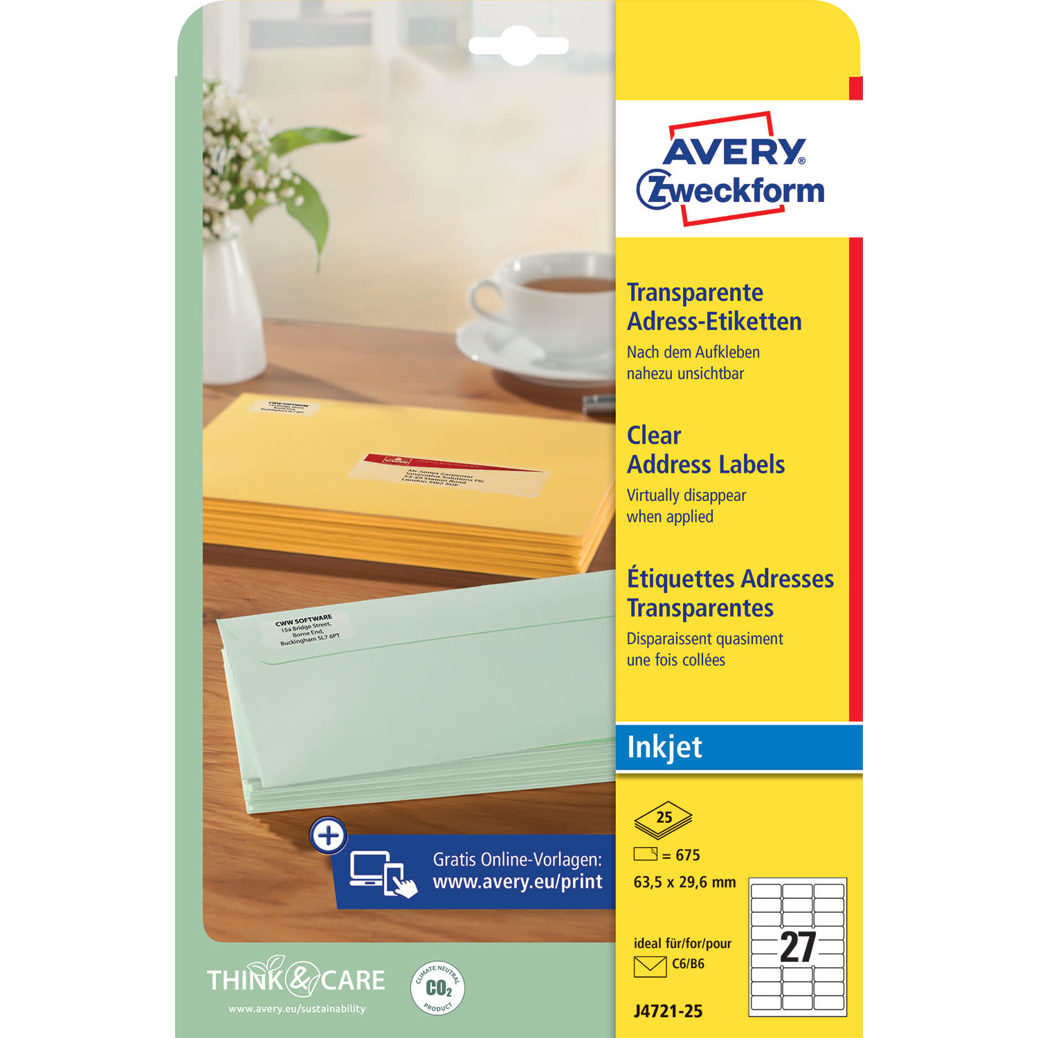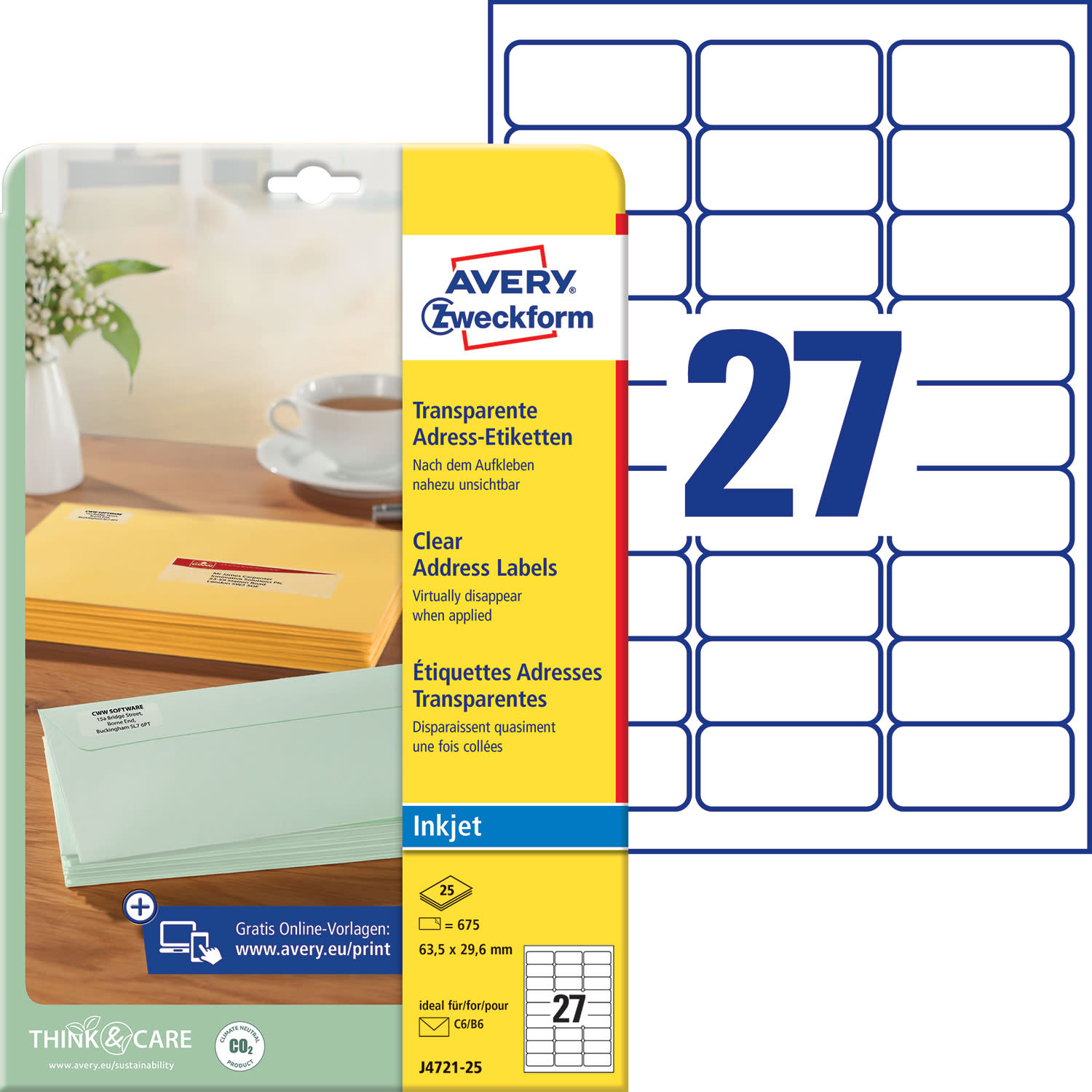 Οι διαφανείς ετικέτες J4721-25 για εκτυπωτές inkjet σε σχήμα 63,5x29,6mm από την AVERY ZWECKFORM είναι ιδανικές για την επισήμανση φακέλων C6. Είναι ετικέτες από πολυεστερική μεμβράνη σε 25 φύλλα ανά συσκευασία. Οι διαφανείς ετικέτες διευθύνσεων σχεδόν εξαφανίζονται, όταν τοποθετούνται, για να έχουν την εμφάνιση εκτυπωμένης ετικέτας. Είναι ιδανικές για ανοιχτόχρωμους φακέλους. Βασίσου στην εκτύπωση χωρίς εμπλοκές, χωρίς να αφήνονται υπολείμματα κόλλας στον εκτυπωτή. Σχεδίασε και εκτύπωσε τις ετικέτες με γρήγορο και εύκολο τρόπο με το δωρεάν πρόγραμμα της Avery Zweckform - Design&Print στη διεύθυνση www.avery-zweckform.eu/print ή με τα βασικά πρότυπα που είναι ενσωματωμένα στο πακέτο Microsoft® Office. Κατάλληλες για όλους τους τυπικούς εκτυπωτές λέιζερ, inkjet και φωτοτυπικά μηχανήματα. Οι ετικέτες από φιλμ χωρίς PVC παράγονται με κλιματικά ουδέτερο τρόπο, οι εκπομπές του υλικού αντισταθμίζονται.