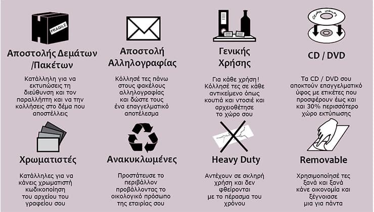 Ετικέτες υψηλής ποιότητας εκτύπωσης, κατάλληλες για όλους τους τύπους εκτυπωτών, γρήγορης και σταθερής επικόλλησης και με δυνατότητα εύκολης αφαίρεσης, χωρίς να αφήνουν ίχνη κόλλας.
