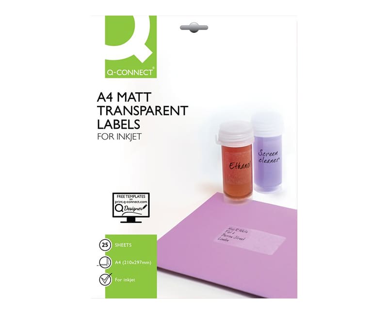 Οι Q-Connect ετικέτες υψηλής ποιότητας εκτύπωσης θα σου χαρίσουν γρήγορη και σταθερή επικόλληση. Τοποθέτησε διαφανείς ετικέτες στους χρωματιστούς φακέλους της αλληλογραφίας σου για τα στοιχεία του παραλήπτη ή του αποστολέα και το αποτέλεσμα θα είναι άψογο! Κάθε πακέτο περιλαμβάνει 25 ετικέτες (25 φύλλα Α4 με μία ετικέτα ανα φύλλο).
