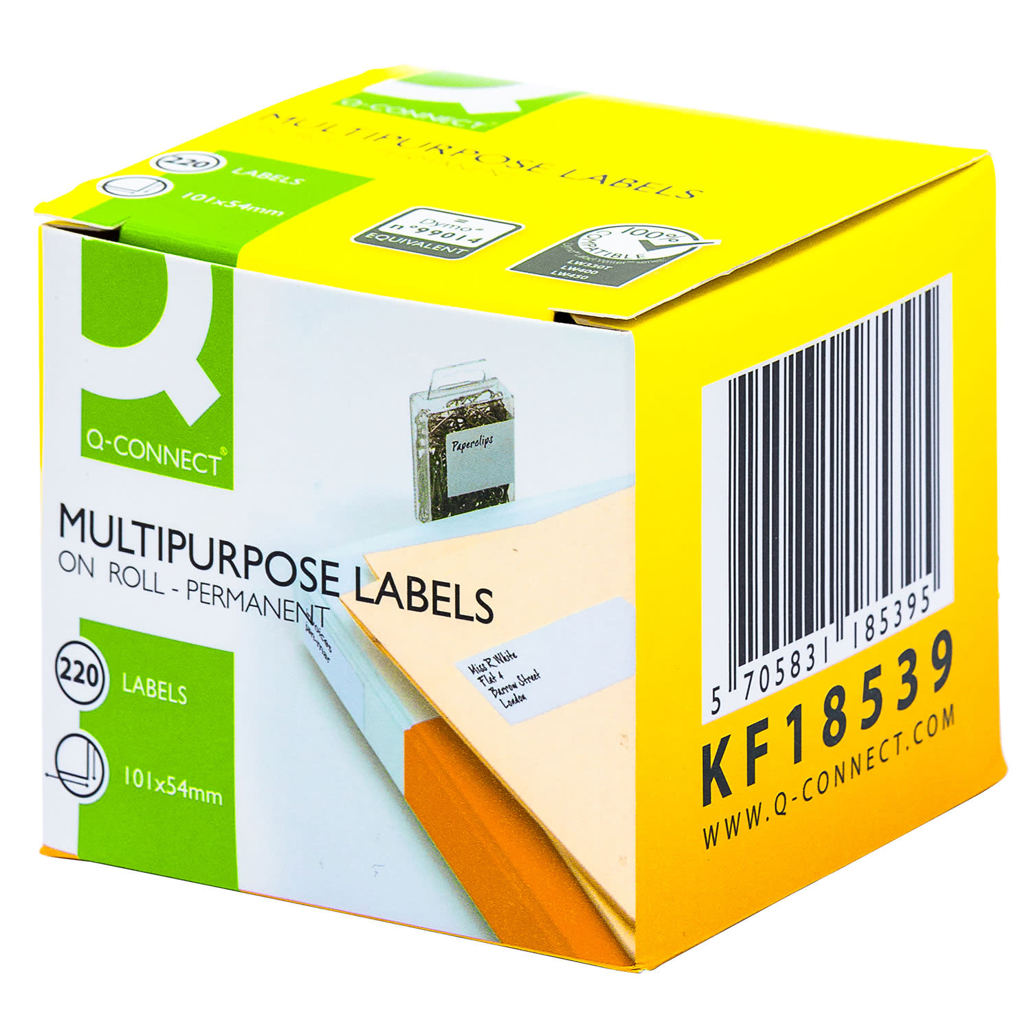 Ρολό με 220 αυτοκόλλητες ετικέτες διευθύνσεων Q-Connect, που είναι ιδανικές για χρήση με τους ετικετογράφους LW 400, LW450, LW DUO, LW TWIN.