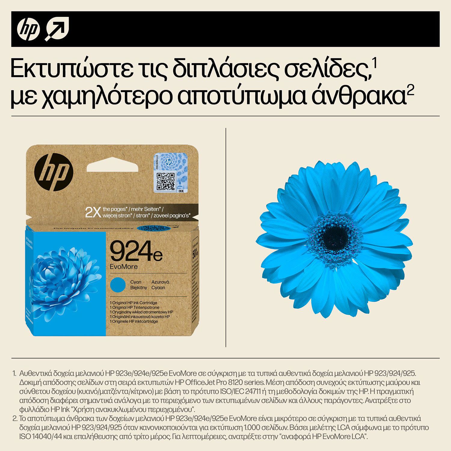 Μελάνι HP 924e EvoMore Cyan για εκτυπώσεις υψηλής ποιότητας με ακρίβεια σε εικόνες και γραφικά. Απόλαυσε ρεαλιστικά αποτελέσματα στις φωτογραφίες σου με μελάνια ειδικά σχεδιασμένα για να καλύπτουν τις εκτυπωτικές σου ανάγκες. Σχεδιασμένα για να εκτυπώνουν διπλάσιες σελίδες σε σύγκριση με τα τυπικά δοχεία, με μικρότερο αποτύπωμα άνθρακα και εύκολα ανακυκλώσιμα, τα αυθεντικά δοχεία μελανιού HP EvoMore συνδυάζουν τη θρυλική απόδοση και ποιότητα της HP με πρόσθετα χαρακτηριστικά βιωσιμότητας.