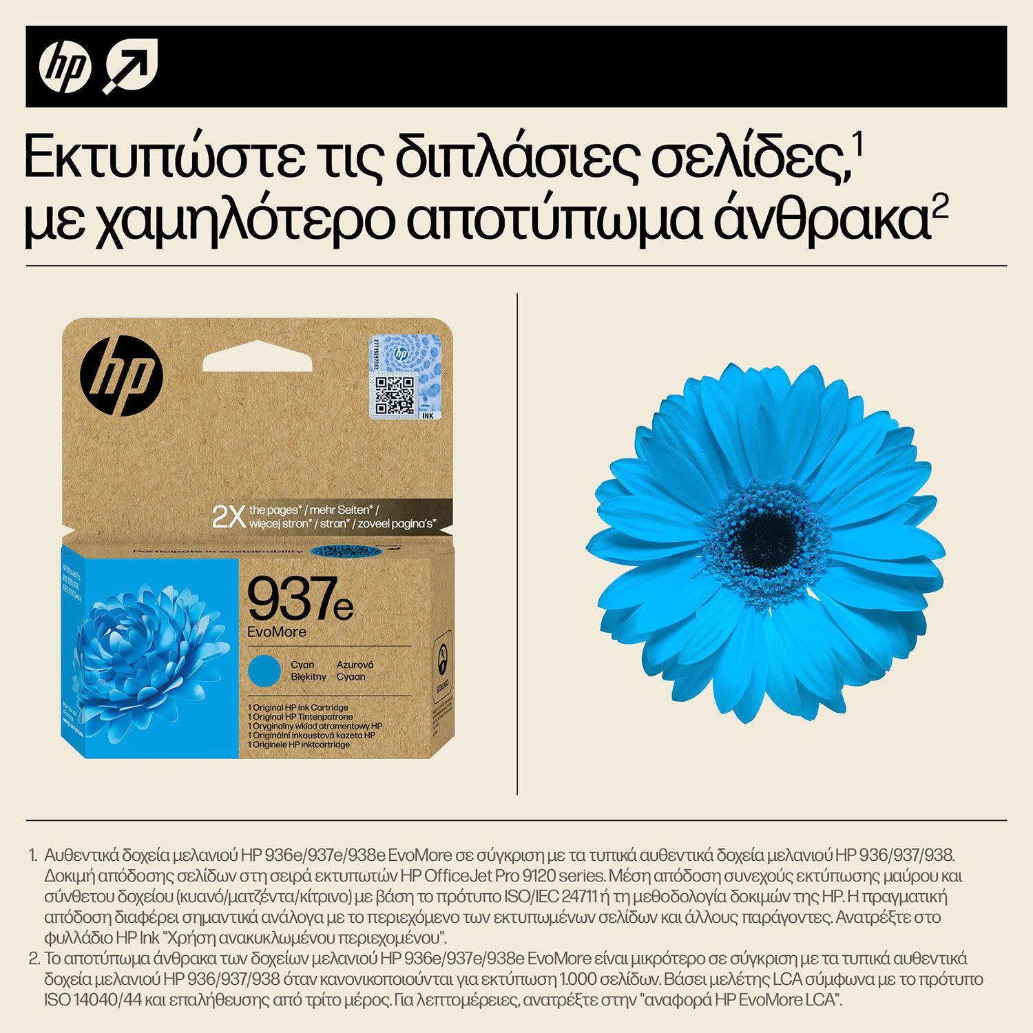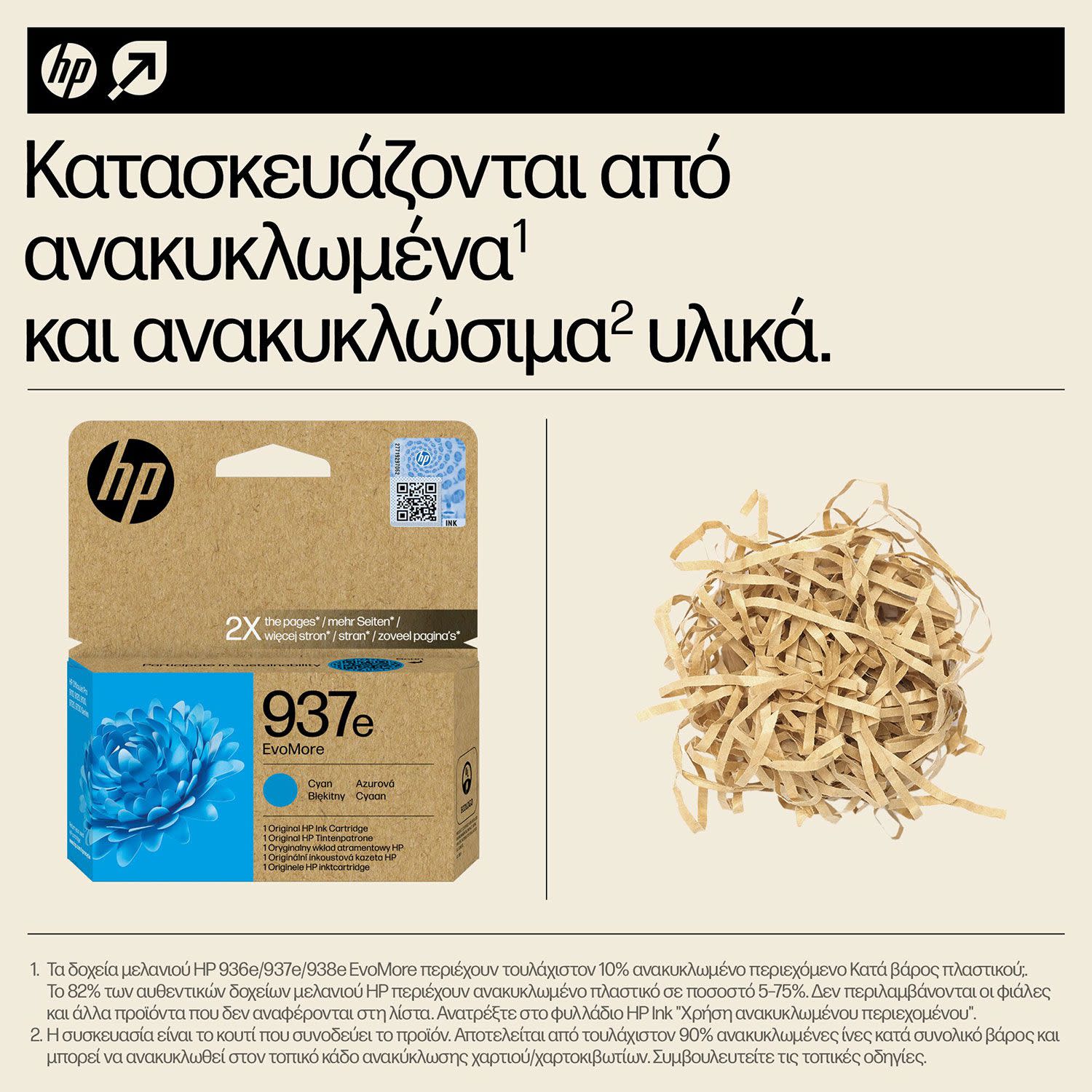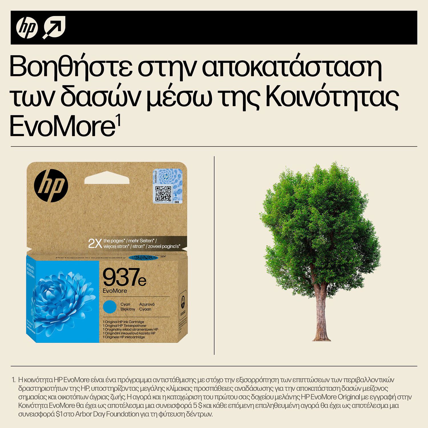 Μελάνι HP 937e EvoMore Cyan για εκτυπώσεις υψηλής ποιότητας με ακρίβεια σε εικόνες και γραφικά. Απόλαυσε ρεαλιστικά αποτελέσματα στις φωτογραφίες σου με μελάνια ειδικά σχεδιασμένα για να καλύπτουν τις εκτυπωτικές σου ανάγκες. Σχεδιασμένα για να εκτυπώνουν διπλάσιες σελίδες σε σύγκριση με τα τυπικά δοχεία, με μικρότερο αποτύπωμα άνθρακα και εύκολα ανακυκλώσιμα,  τα αυθεντικά δοχεία μελανιού HP EvoMore συνδυάζουν τη θρυλική απόδοση και ποιότητα της HP με πρόσθετα χαρακτηριστικά βιωσιμότητας.