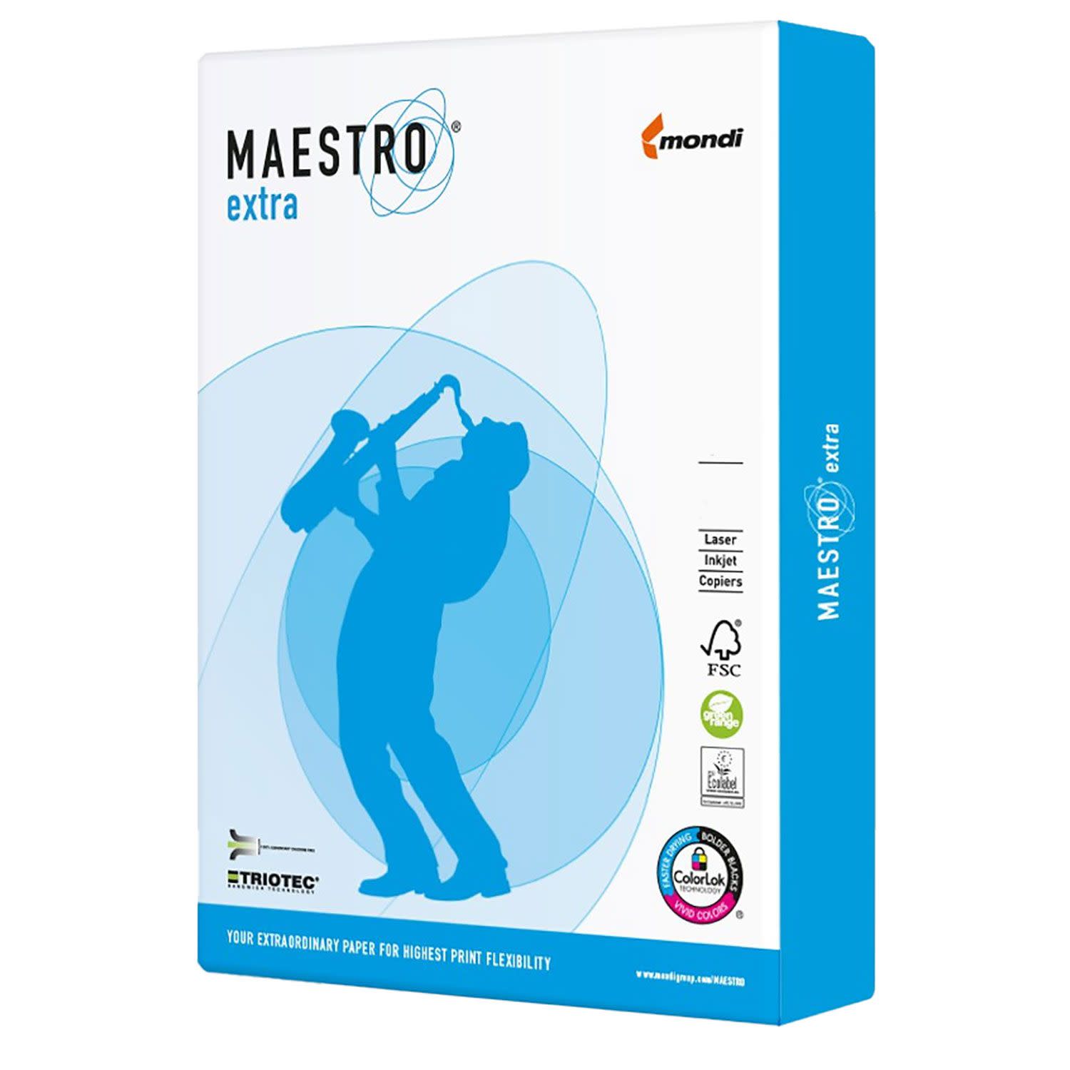 Το MAESTRO extra είναι ένα εξαιρετικά ευέλικτο χαρτί υψηλής ποιότητας. Είναι εξαιρετικά λευκό, γεγονός που το καθιστά τέλεια επιλογή για εκτύπωση κειμένου και πολύχρωμων γραφικών με δυναμικές αντιθέσεις. Η συσκευασία περιέχει 250 Φύλλα Α3 και βάρους 160gr και είναι ιδανικό για όλες τις ψηφιακές εκτυπώσεις laser, inkjet και φωτοαντίγραφα.