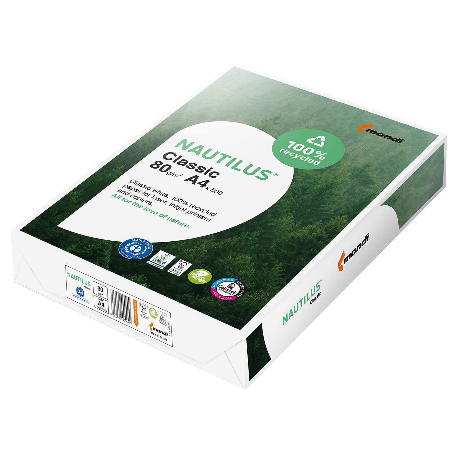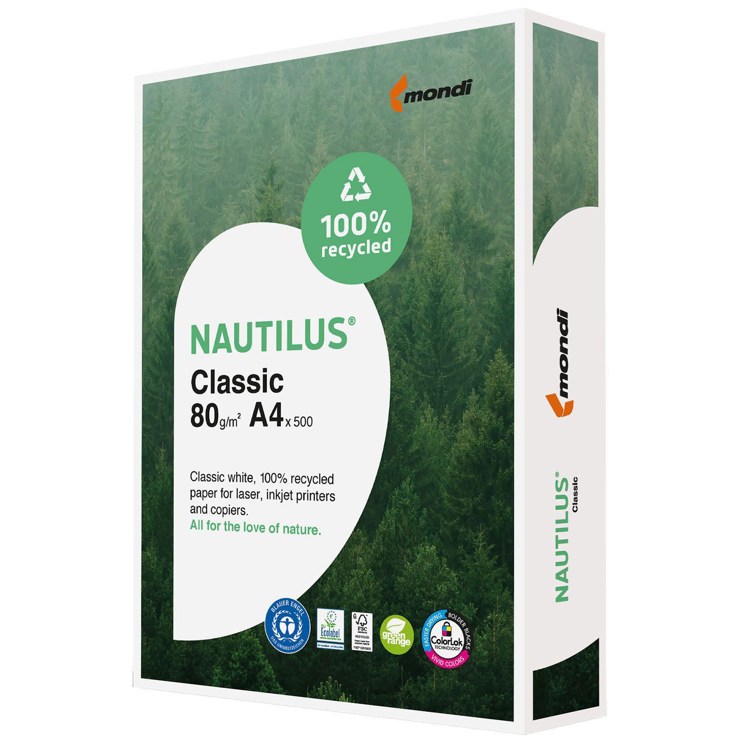 Η οικολογική σειρά Nautilus αποτελείται από 100% ανακυκλωμένο χαρτί υψηλής ποιότητας. Είναι ιδανικό τόσο για έγχρωμες, όσο και για ασπρόμαυρες εκτυπώσεις, αποδίδοντας εξαιρετικά τα χρώματα. Επιπλέον, η διαδικασία λεύκανσης έχει γίνει χωρίς τη χρήση χλωρίου, ενώ η διαδικασία παραγωγής έχει αποσπάσει την πιστοποίηση ISO 14001 (environmental management).