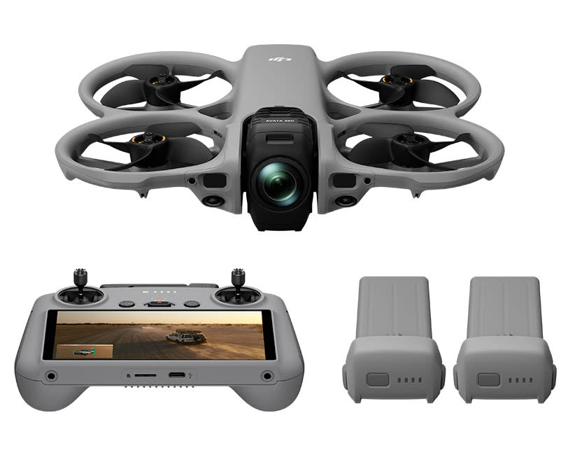 Το πακέτο περιέχει DJI Avata 360, το χειριστήριο RC 2, τρείς Intellgent Flight Batteries, charging hub και sling bag.