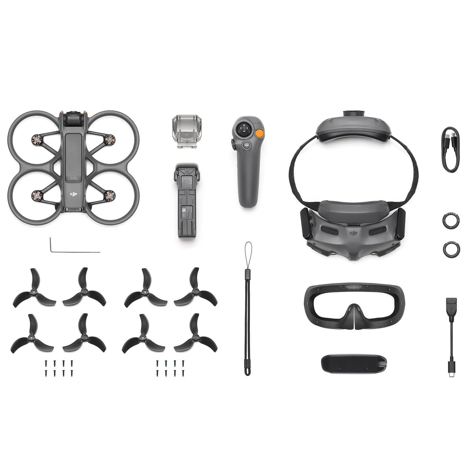 Η συσκευασία περιλαμβάνει: DJI Avata 2 (1x), Goggles 3, RC Motion 3, έξυπνη μπαταρία πτήσης DJI Avata (1x), έλικες DJI Avata (2x ζεύγη), DJI Avata Gimbal Protector (1x), μετασχηματιστή DJI Avata (1x), καλώδιο PD τύπου C σε Type-C (1x), ένα κατσαβίδι και βίδες (7x M2).