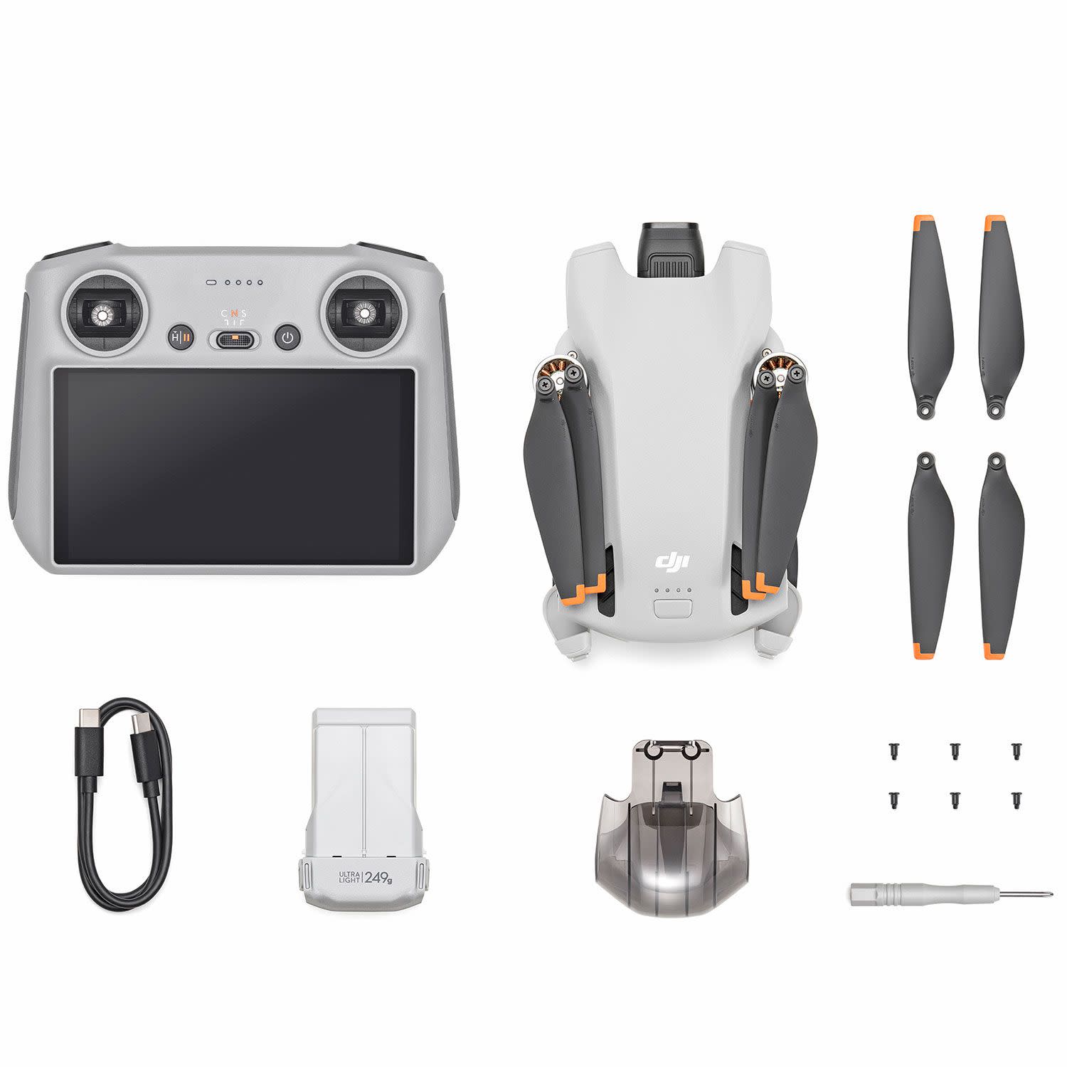 Εκτός από το DJI Mini 3, στη συσκευασία περιλαμβάνεται και το ελαφρύ — με ενσωματωμένη οθόνη υψηλής ανάλυσης και νέους μοχλούς διπλού ελατηρίου (Dual-Spring Control Sticks) — χειριστήριο DJI RC.