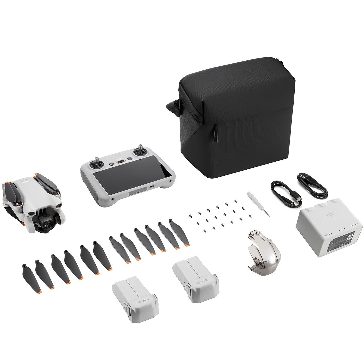 Εκτός από το DJI Mini 3, το Fly More Combo περιλαμβάνει: χειριστήριο DJI RC, Gimbal Protector, 6x σετ προπέλες, 3x μπαταρίες Intelligent Flight, θήκη, τσάντα μεταφοράς, Battery Charging Hub, βίδες και κατσαβίδι, καλώδια μεταφοράς δεδομένων και φόρτισης.